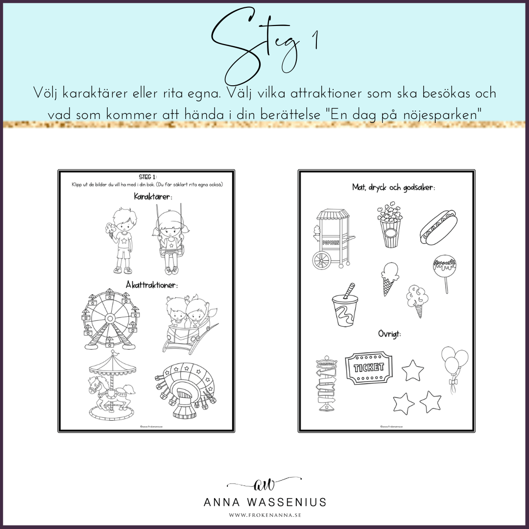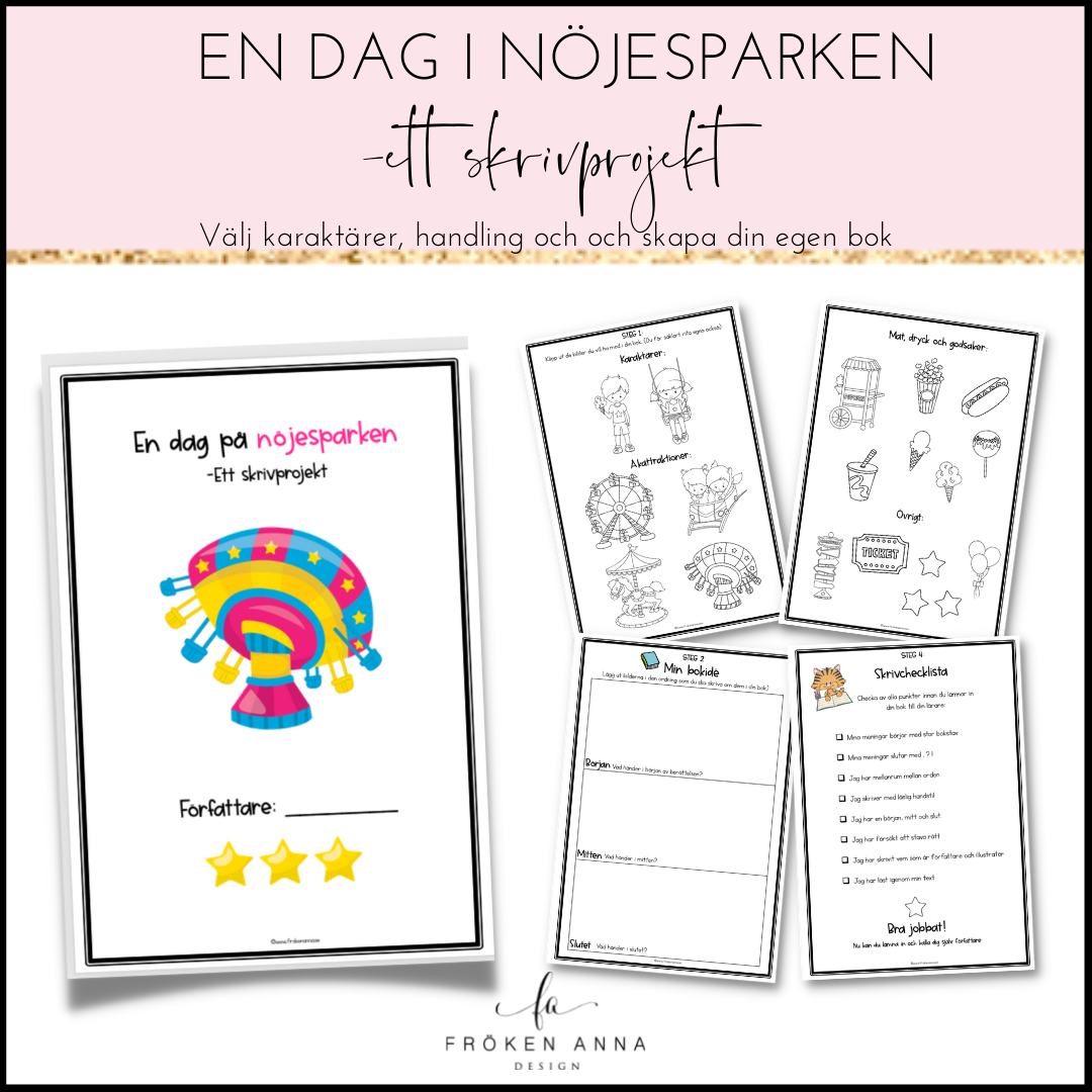 I skrivprojektet ”En dag pĂ„ nöjesparken” fĂ„r eleverna genom ett motiverande och kreativt arbetssĂ€tt ta sig igenom hela skrivprocessen frĂ„n planering, skriva med röd trĂ„d och kontrollera sitt eget skrivande.