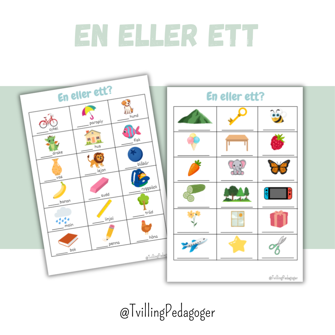 Träna på en eller ett. Materialet innehåller 2 sidor med 36 olika substantiv och finns i två nivåer.