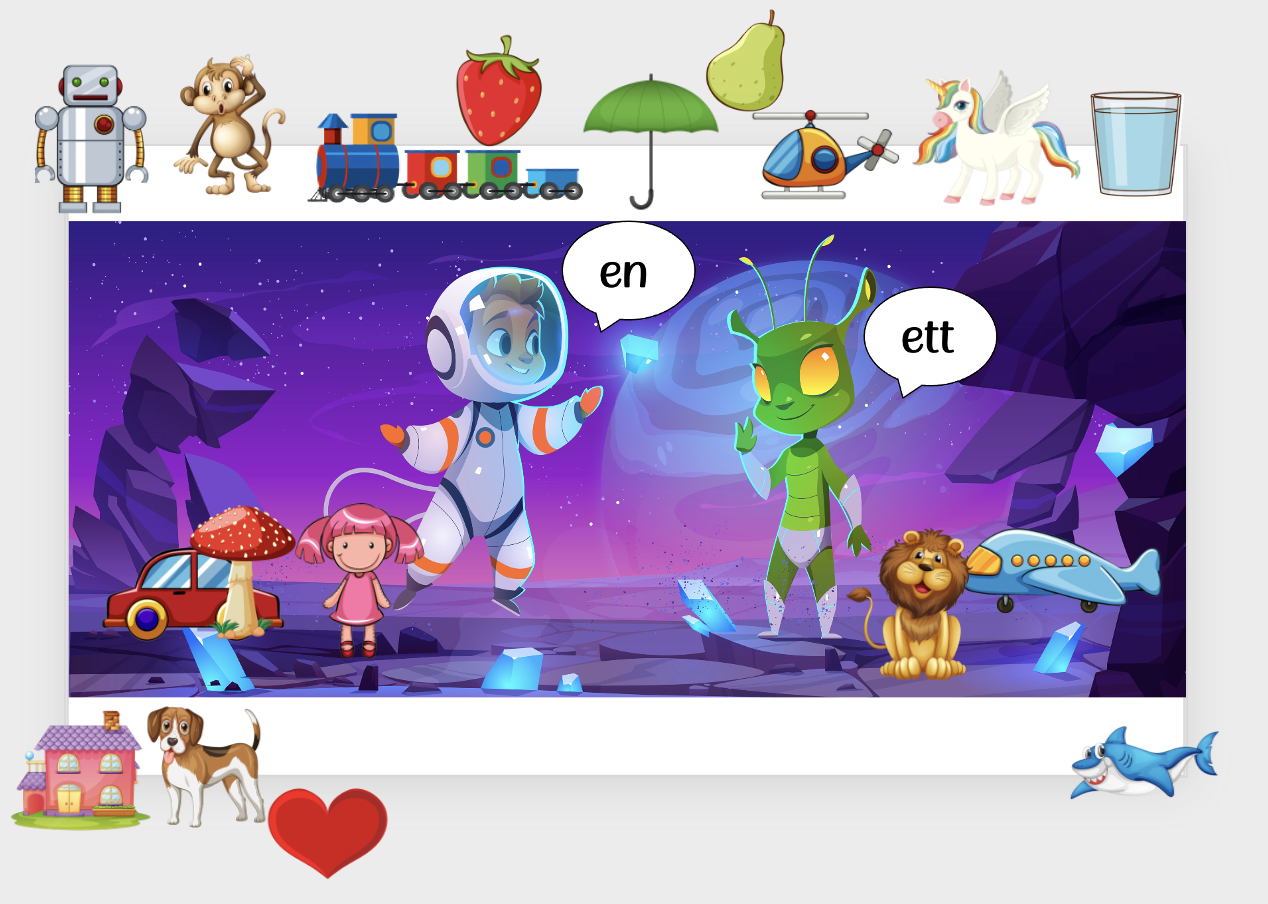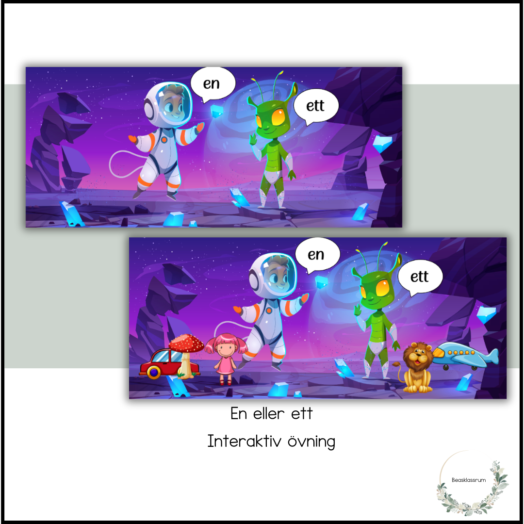 Interaktiv övning där 18 föremål ska placeras hos astronauten som vill ha alla en-ord eller hos utomjordingen som vill ha alla ett-ord.