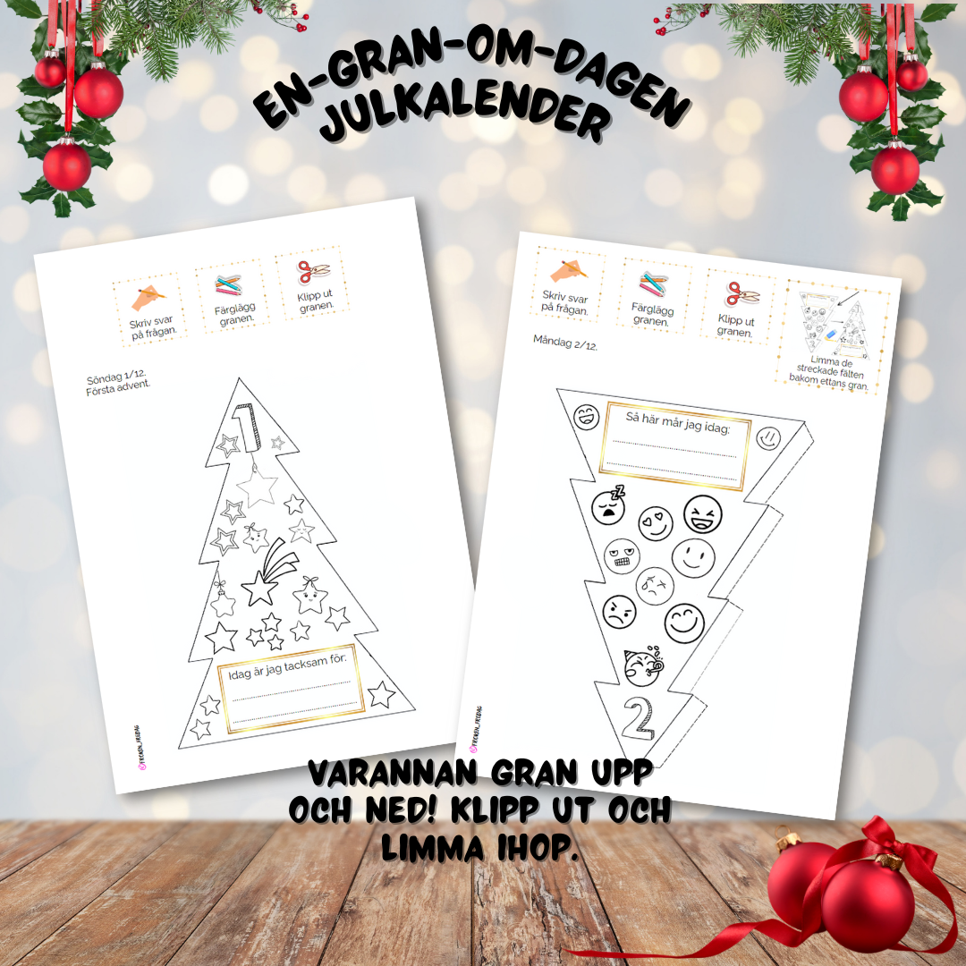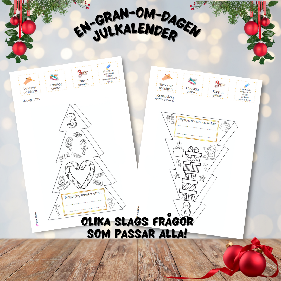 En rolig julkalender! Varje elev får en gran om dagen, att svara på frågan och färglägga. Sedan ska alla granar klippas och och limmas ihop. Det färdiga alstret blir EN stor julgran till varje elev =) Kul att ta hem och spara också. Frågorna handlar om värdegrund, vänskap, mina känslor, skriva önskelistor med mera.