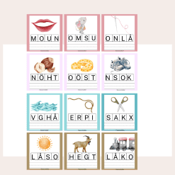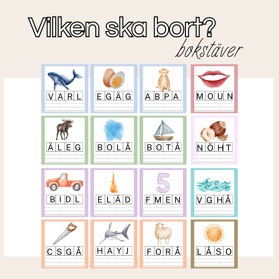 En bokstav ska bort. Ett material med 24 kort där eleven ska trycka över den bokstaven som ska bort och sedan skriva ordet på bilden. Alla ord består av 3 bokstäver.