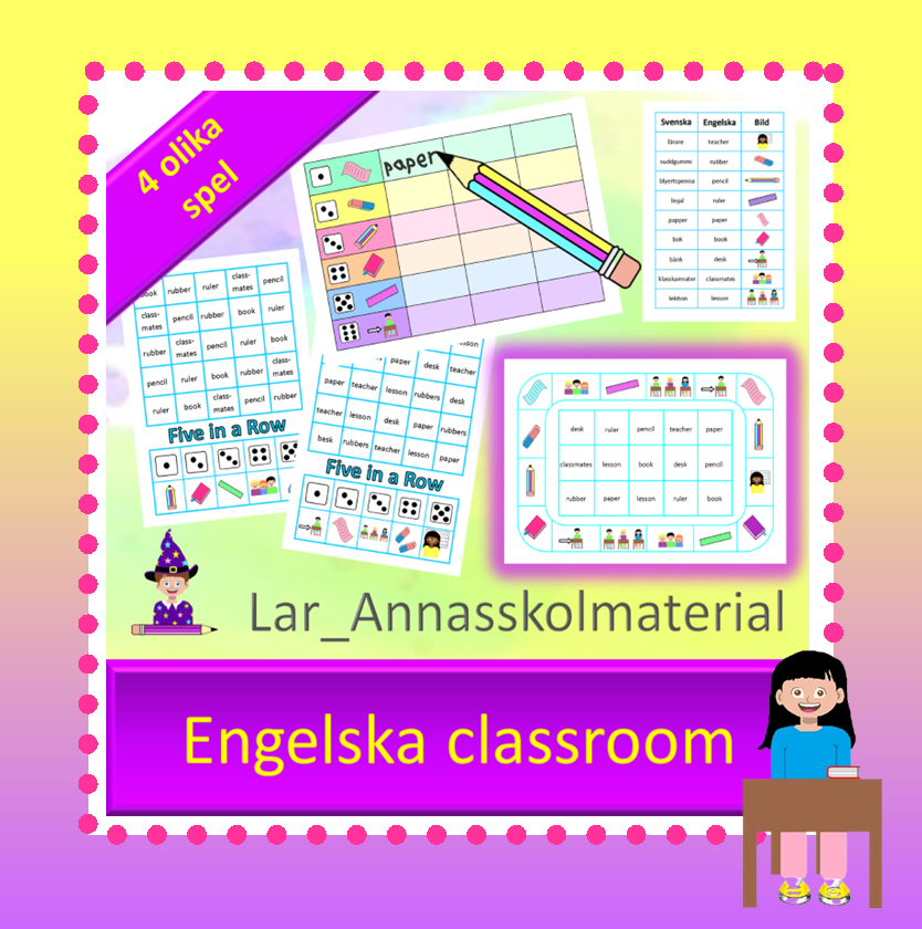 Spelregler: Varje spelare har sin egna bricka. En elev börjar med att slå tärningen och kryssar över ordet som tärningen visar. Sedan fortsätter de tills en av eleverna har fått fem i rad. Slår man en 6 går turen vidare.