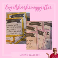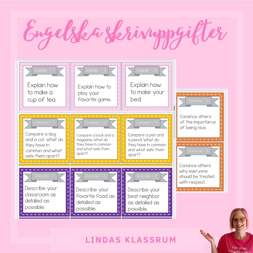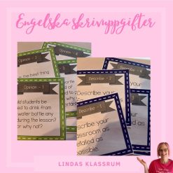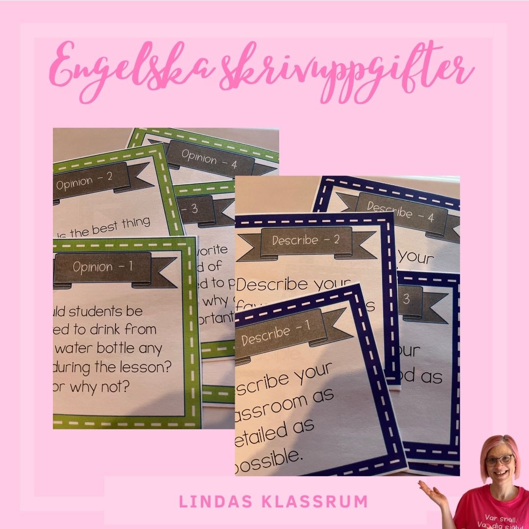 Dessa uppgifter används i engelskaundervisningen och du kan använda det både som skrivuppgifter och som samtalsuppgifter. Det finns 36 olika uppgifter, 6 olika teman med 6 uppgifter till varje tema.