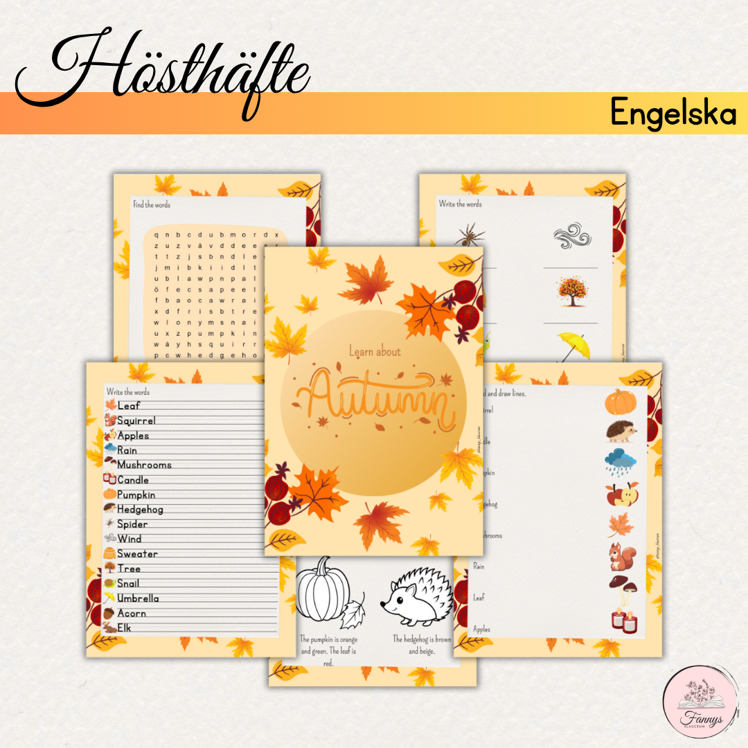 Arbetshäfte på 10 sidor med tema hösten på engelska. Innehåller bland annat ordgömma, dra streck till rätt bild och läs och måla.