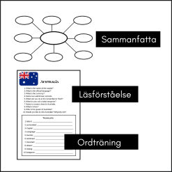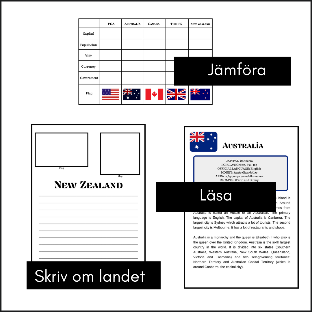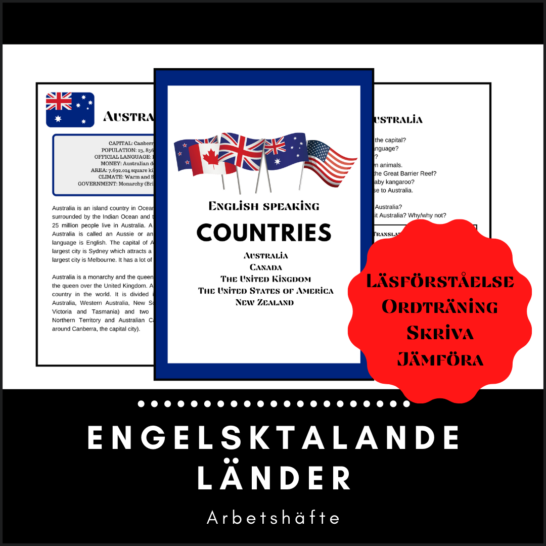 Ett häfte med läsförståelse om USA, Storbritannien, Australien, Nya Zeeland och Kanada samt arbetsblad för jämförelse och tankekarta.