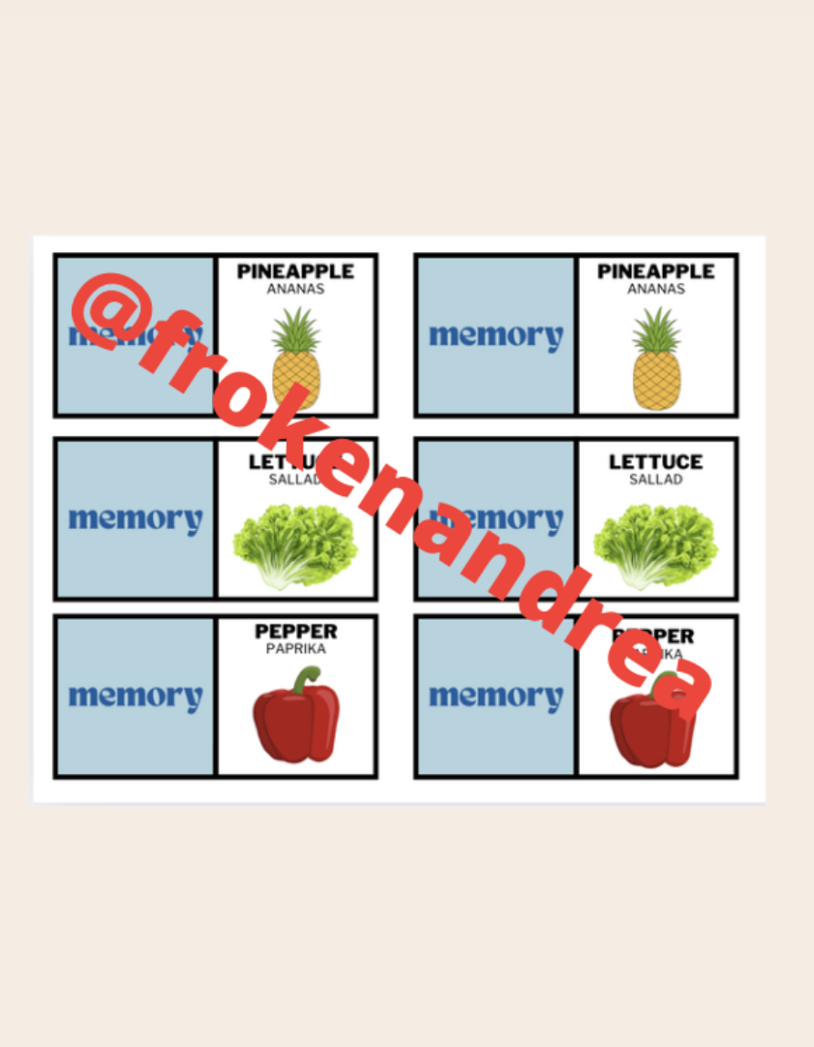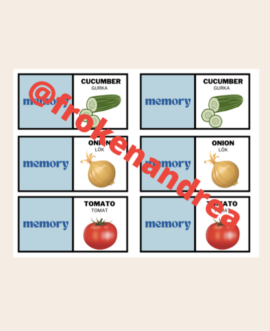 Memory på engelska med temat grönsaker och 24 kort. Begreppen står på både engelska och svenska. Skriv ut och vik korten så de får en fram- och baksida. Laminera sedan så blir det som ett kortspel.