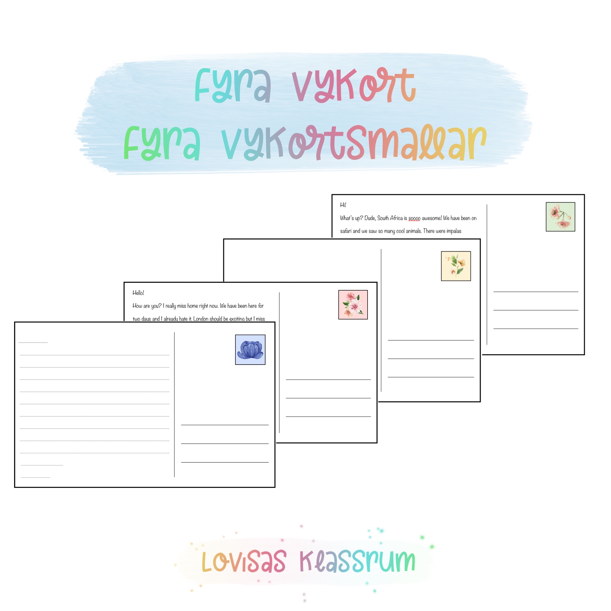 Söker du en enklare skrivuppgift till dina elever? Då har du kommit rätt! I materialet ingår fyra vykort från fiktiva personer som skickats från engelskspråkiga länder. Det ingår även fyra vykortsmallar, två med stödlinjer och två utan. Eleverna får öva på att läsa vykort skrivna på engelska samt skriva ett svar på engelska.
