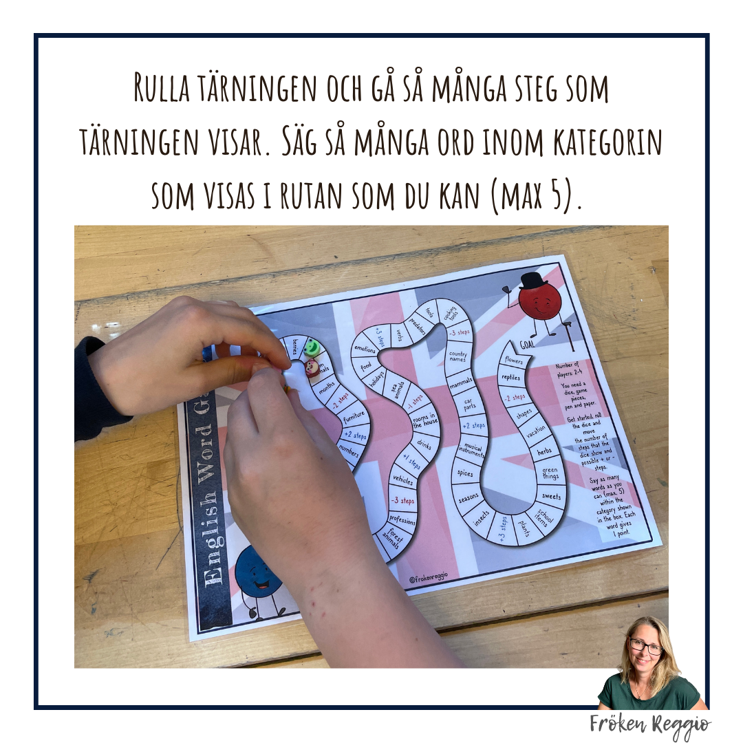 Ett spel för 2-4 spelare. Rulla tärningen och gå så många steg som tärningen visar. Säg så många ord inom kategorin som visas i rutan som du kan (max 5).