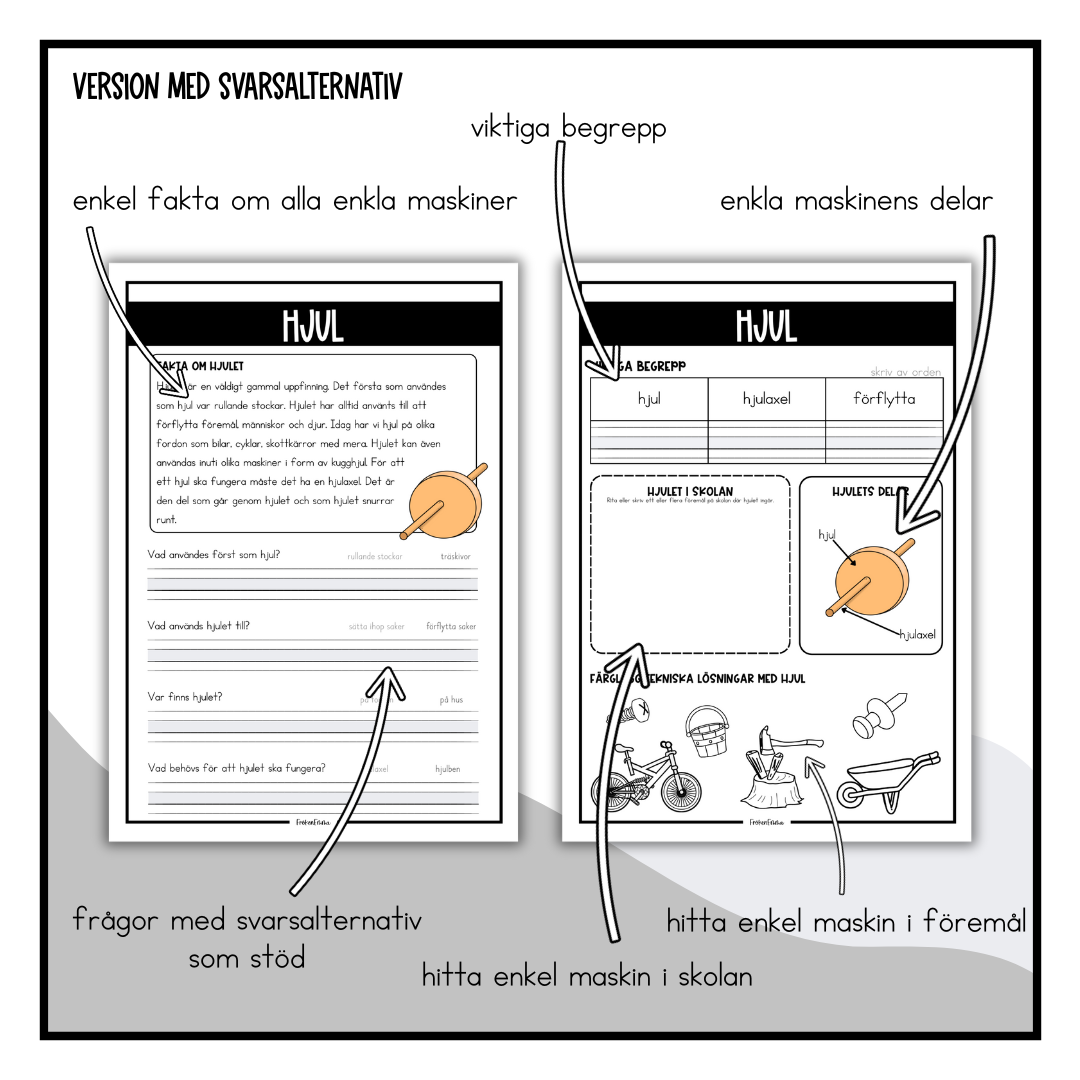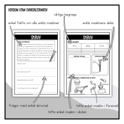 Detta material på 20 sidor + ett materialtillbehör syftar till att lära barnen om våra sex enkla maskiner. Materialet är fyllt med enkel och lättförstådd fakta om varje enkel maskin, samt generellt om de enkla maskinerna. Varje kort faktatext följs av fyra frågor. I den ena versionen av materialet finns svarsalternativ som eleverna kan välja mellan och även skriva av. Detta för att kunna stötta även de elever som har svårt med skriva och stava. Denna version passar till exempel elever i årskurs 1. Den andra versionen är utan svarsalternativ och har bara en enkel skrivrad för de elever som klarar det. Efter det får eleven möta tre viktiga begrepp om varje enkel maskin, den enkla maskinens delar, hitta den enkla maskinen i skolan och bland olika tekniska lösningar. I materialet finns även olika extrauppgifter för att befästa kunskaperna ytterligare som att hitta enkla maskiner i bilder, ordgömma, sorteringsövning och målarbild.