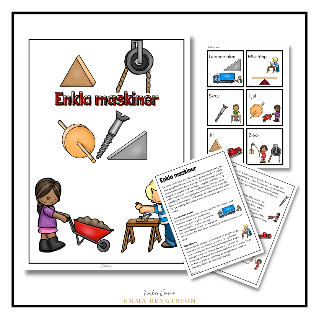 Material på 24 sidor om enkla maskiner. Materialet innehåller: