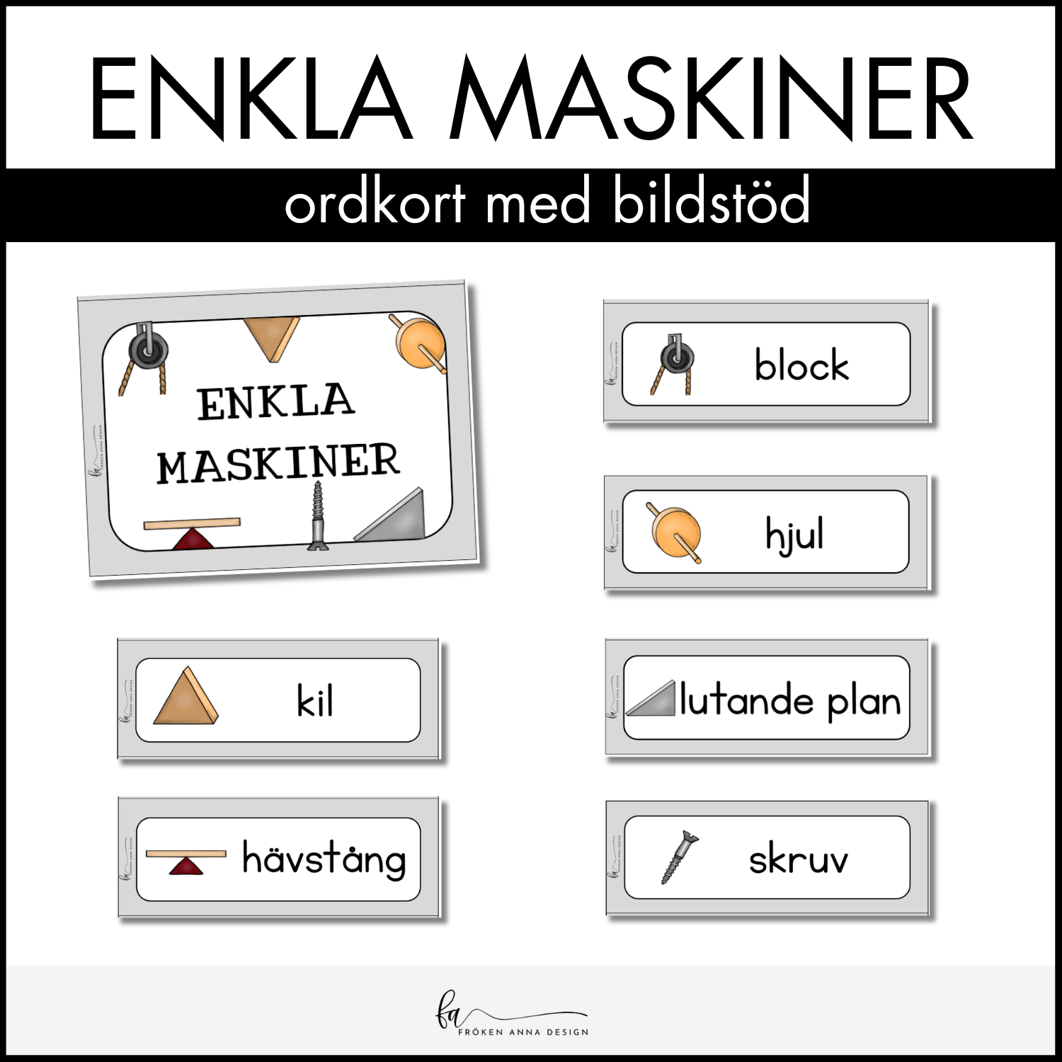 - 6 ordkort med illustrationer och maskinernas namn: Block, Hjul, Kil, Lutande plan, Hävstång och Skruv.