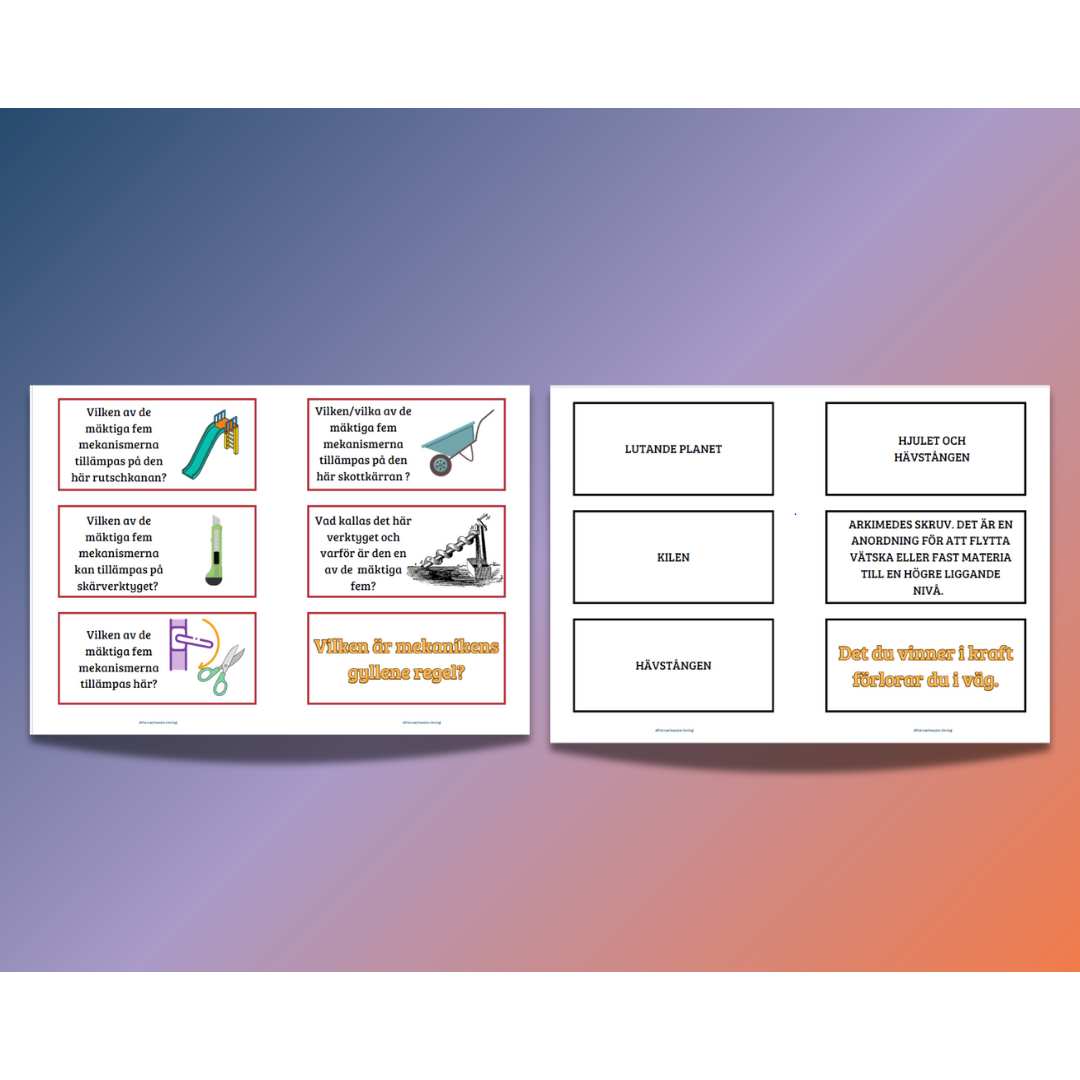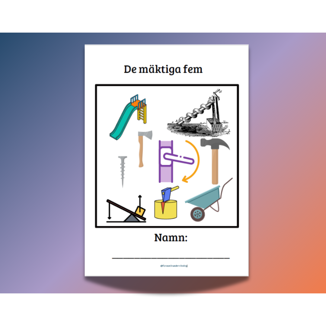 De mäktiga fem – enkla mekanismer är ett arbetsmaterial med tillhörande kort. Materialet är baserat på ”De mäktiga fem” filmerna från https://globalentertainment.se/demaktigafem.