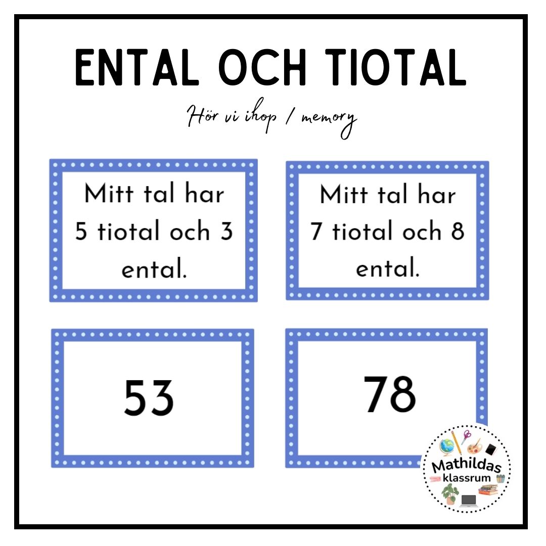 Materialet övar ental och tiotal. Kan användas som exempelvis memory eller hör vi ihop. Det finns 24 ”par” i materialet.