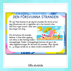 I upplägget ”Escape room – Den försvunna stranden” är klassen på väg till stranden för en skön dag när ni upptäcker att ni kommit vilse och det finns ingen strand i sikte utan bara ängar och skog. Genom att lösa olika uppgifter korrekt får eleverna sex delar som är koder för att lösa det sista uppdraget. De behöver alla delar för att lösa mysteriet och få rätt vägbeskrivning till stranden.