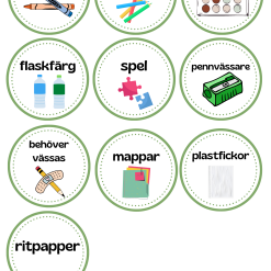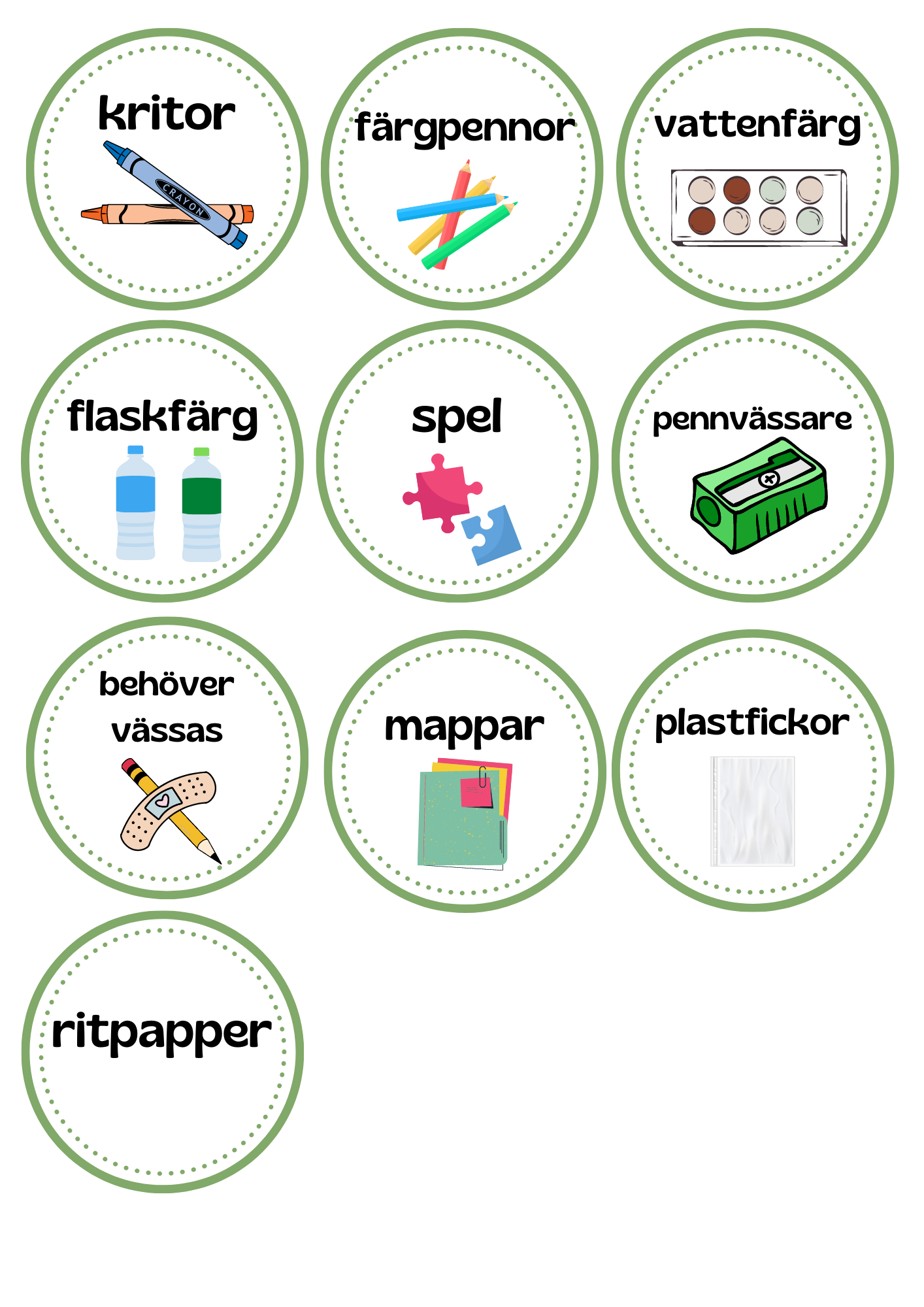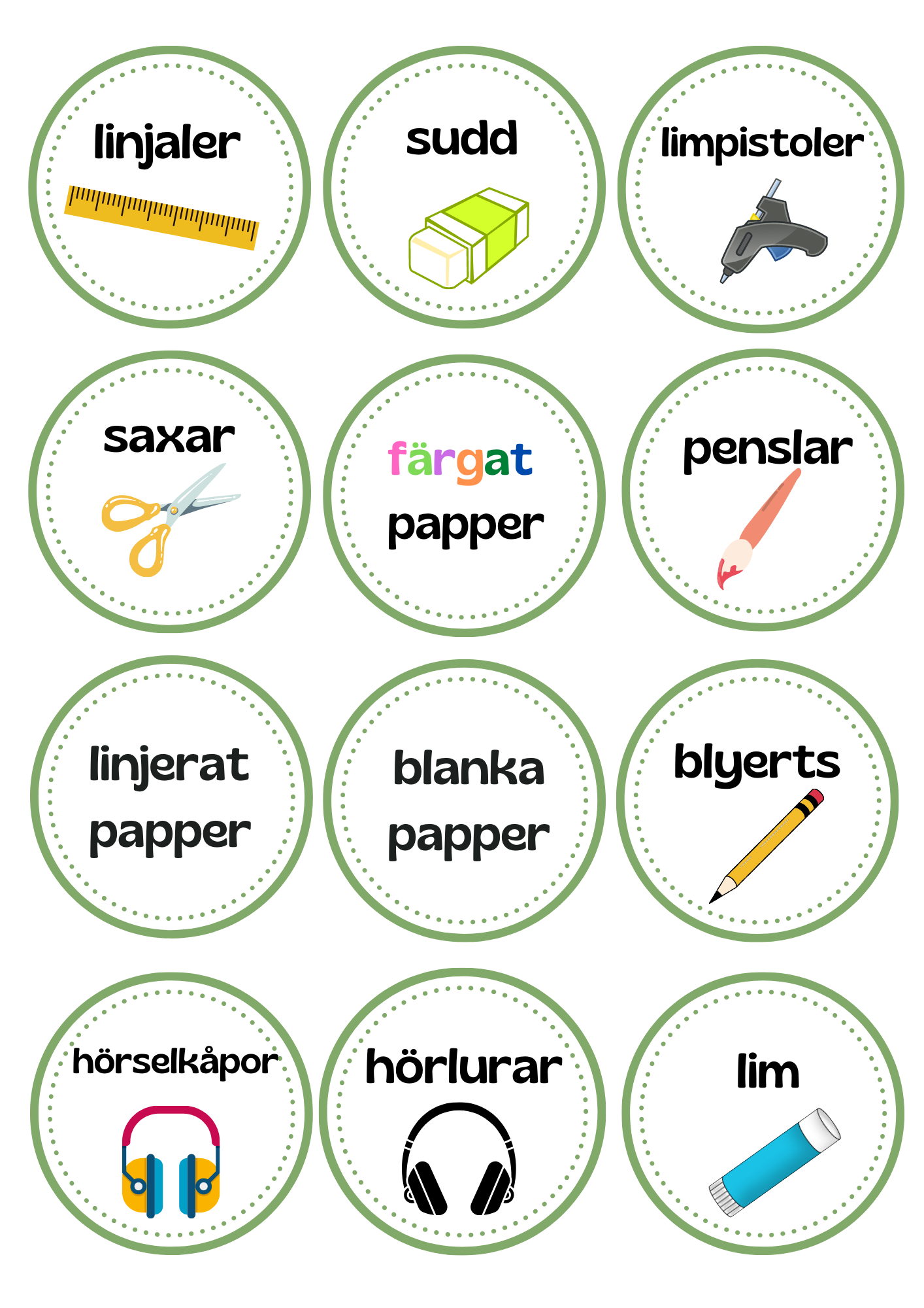 Runda etiketter för att organisera klassrummet. Grön färg.