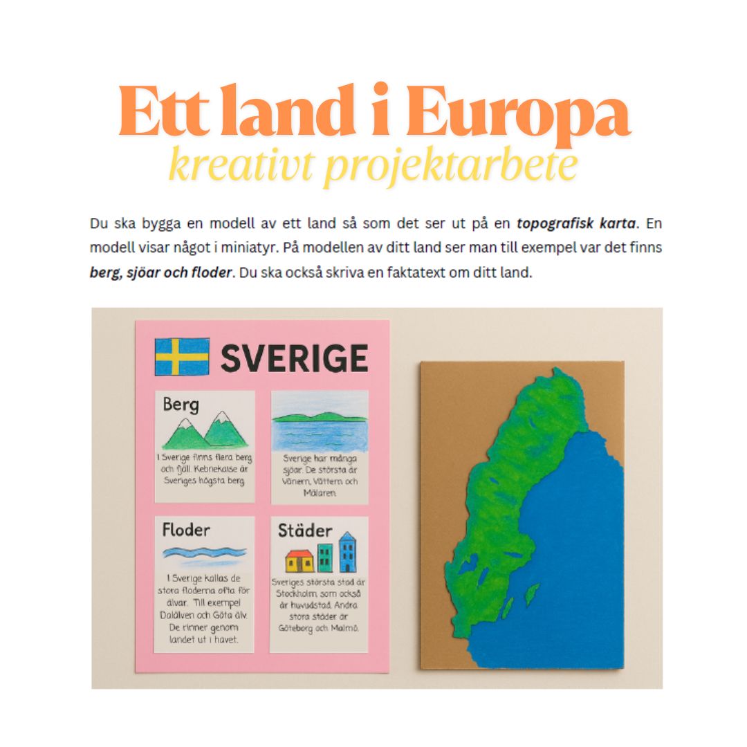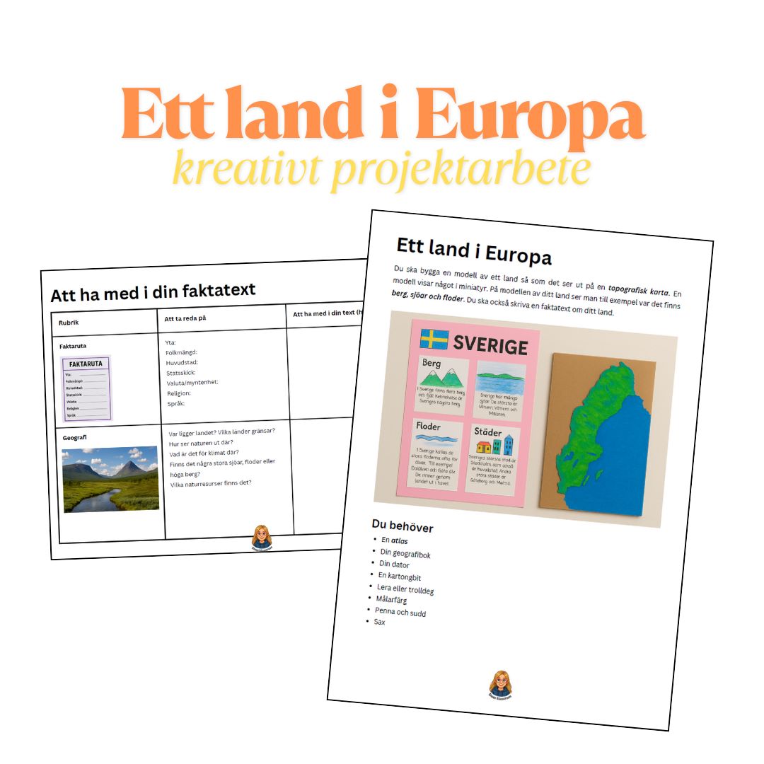 En kreativ och lärorik uppgift där dina elever både får fördjupa sig i fakta och bearbeta med konkret material! Med uppgiften ”Ett land i Europa” arbetar eleverna undersökande och skapande genom att: