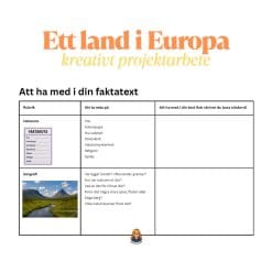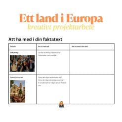 - Skriva en faktatext om ett europeiskt land – med stödstruktur för att hitta relevant information om t.ex. geografi, befolkning, kultur, språk och religion.