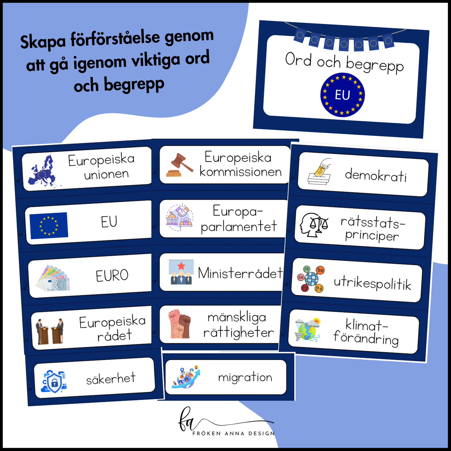 Läsförståelse om Europeiska Unionen, EU, med bildstöd. Gå med fördel igenom bildstöden före ni anammar texten för att skapa en förförståelse om innehållet. Läsförståelsen finns i två nivåer med efterföljande frågor till.