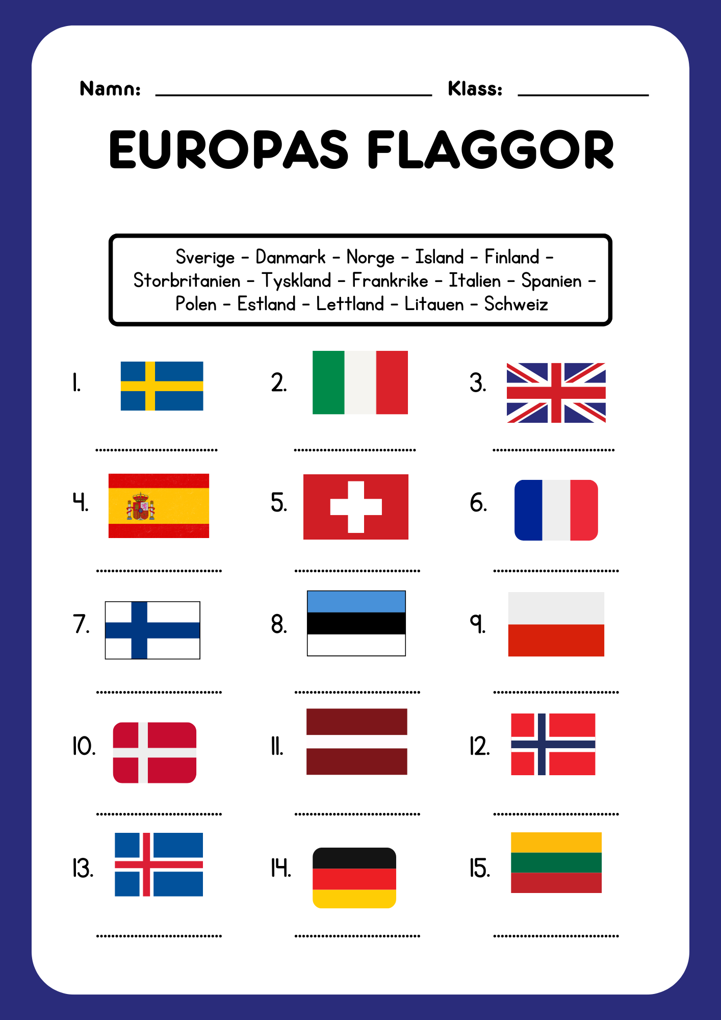 Arbetshäfte 2 sidor: skriv rätt namn vid rätt flagga, måla flaggor