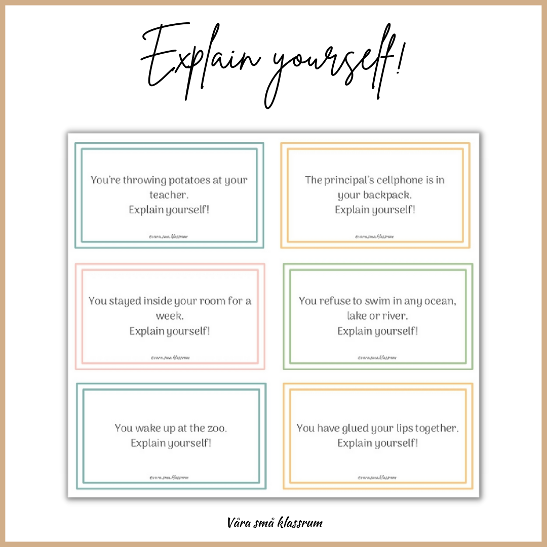 Så rolig övning. Eleverna kan göra i grupper eller tsm i helklass. Kan också användas som skrivuppgift. Passar bra även på högstadiet