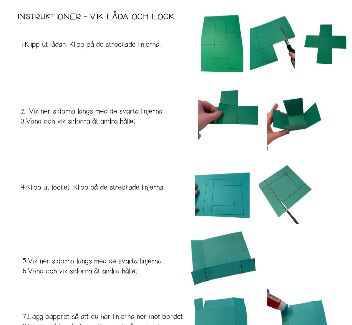 Materialet innehåller mall till låda och lock, små lappar att klistra inuti lådan där eleverna själva kan skriva och instruktioner (text+bild).
