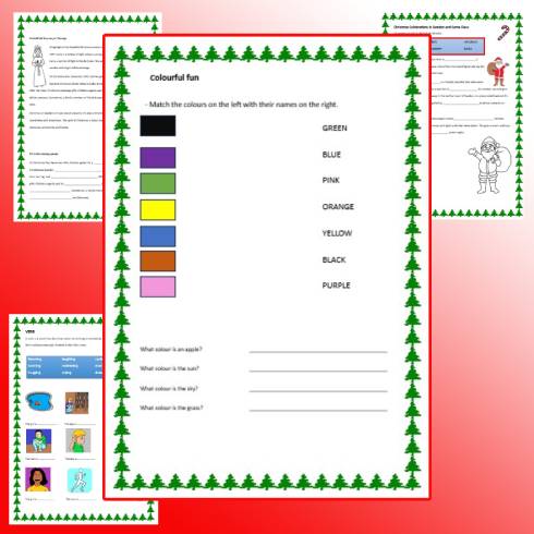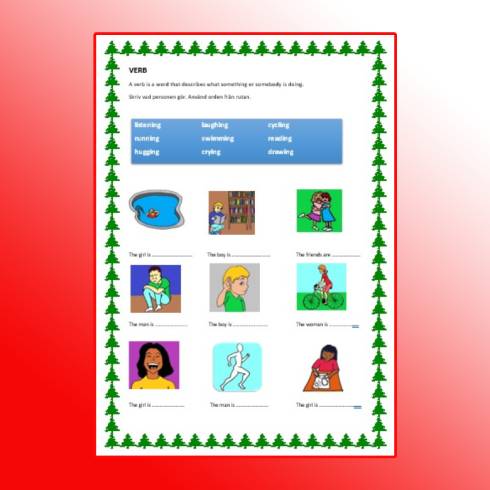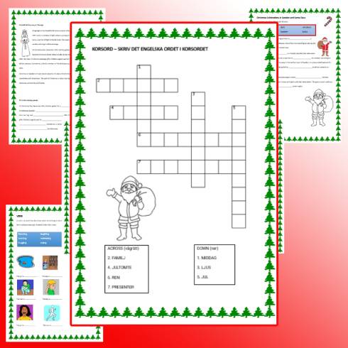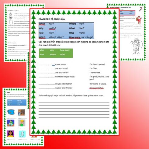 Engelska övningar som t ex verb, läsförståelse, lucktext, färger, frågeord och korsord.