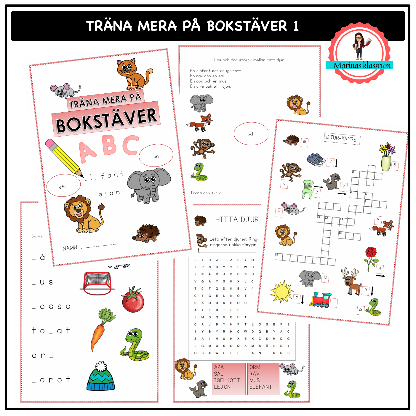 Eleverna får möta följande djur som representerar bokstäverna: säl, igelkott, lejon, orm, räv, elefant, mus, apa.