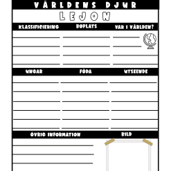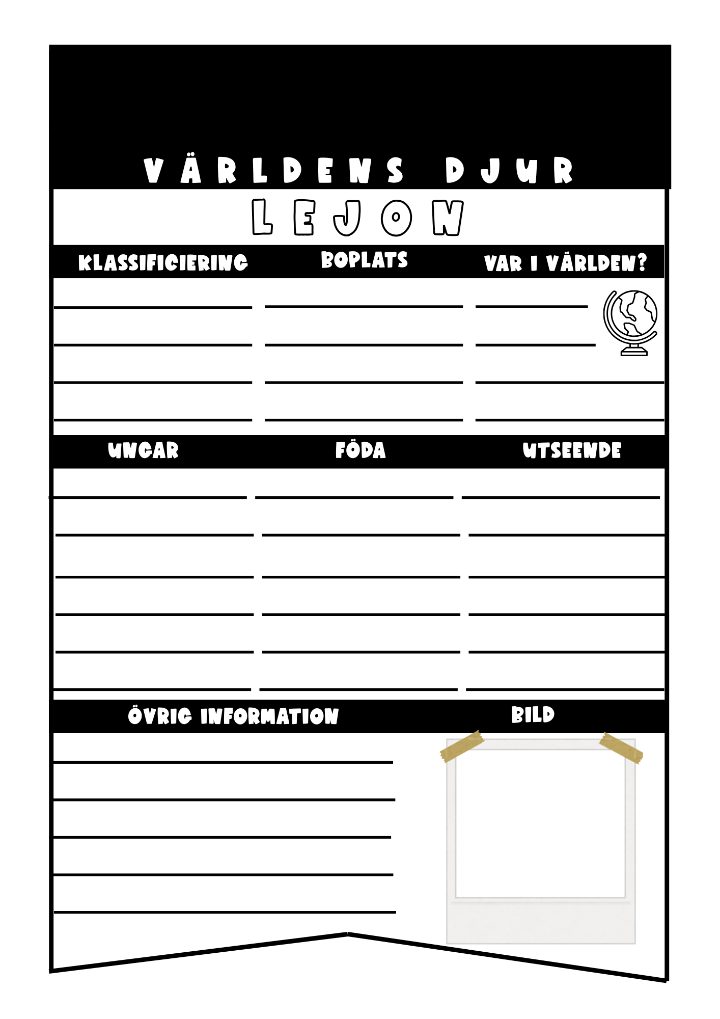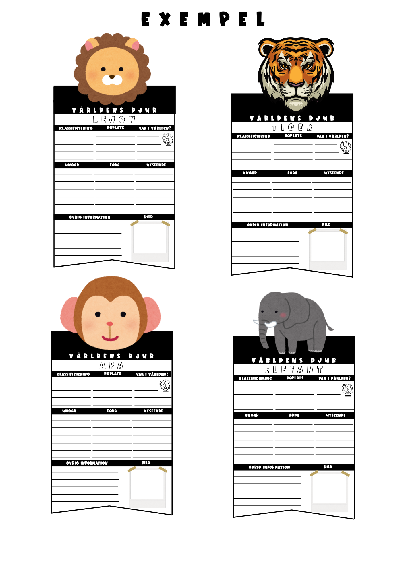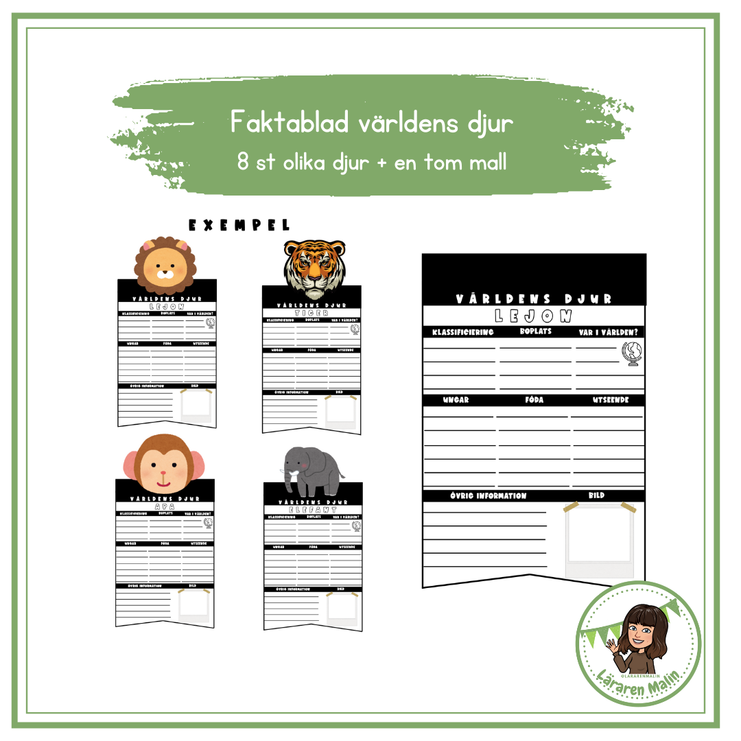Faktablad till världens djur. Skriv fakta om olika djur. 8 stycken djur ingår (lejon, tiger, apa, sengångare, åsna, elefant, giraff, buffel) samt en tom mall till världens djur. Svartvita & färgade bilder följer med materialet.