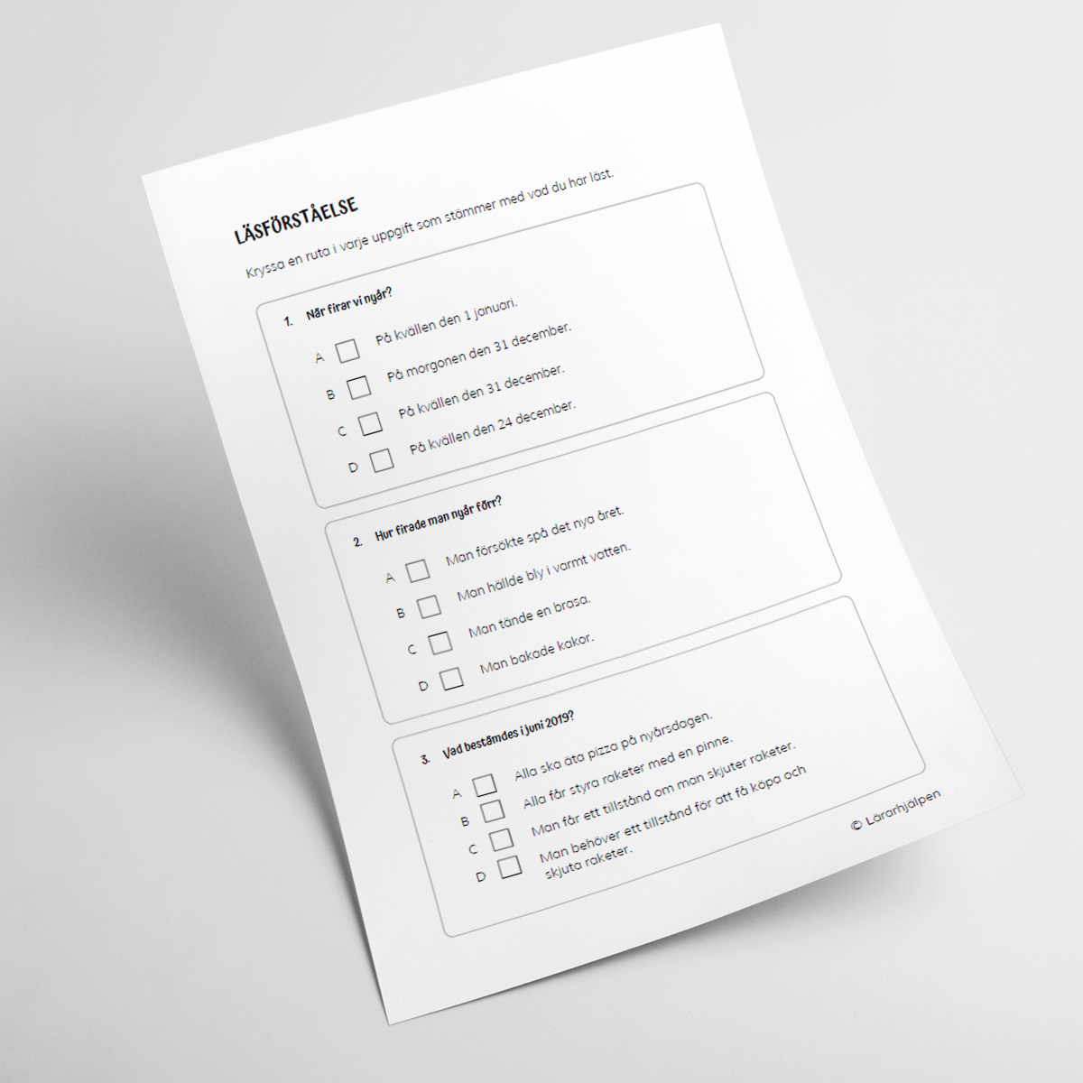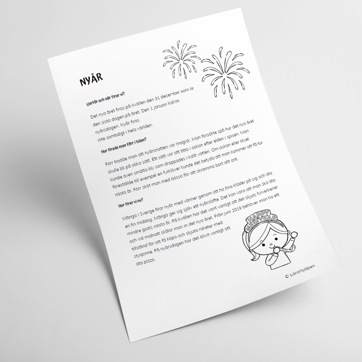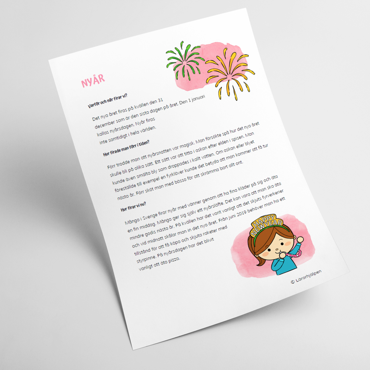 I samband med nyår passar detta dokument perfekt att använda! Dokumentet består av två sidor, en med faktatexten och en med läsförståelsefrågor till texten. Frågorna består av svarsalternativ och eleverna kryssar en ruta per fråga. För att spara papper skriver du ut sidintervallet 2-3 och skriver ut dubbelsidigt för att få frågorna på baksidan. Inkluderar en version i färg och en svartvit.