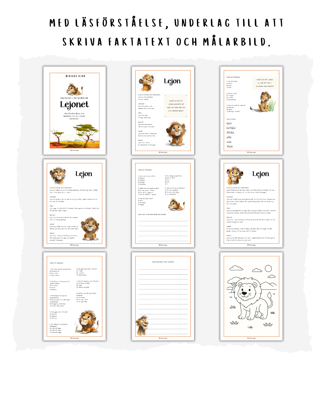 Till varje text finns läsförståelsefrågor, både på och under textens yta. Eleverna får även ett linjerat skrivblad med illustration av ett lejon att använda när de skriver sin egen faktatext. Dessutom ingår en målarbild som kan användas i dokumentation eller som kreativt inslag.