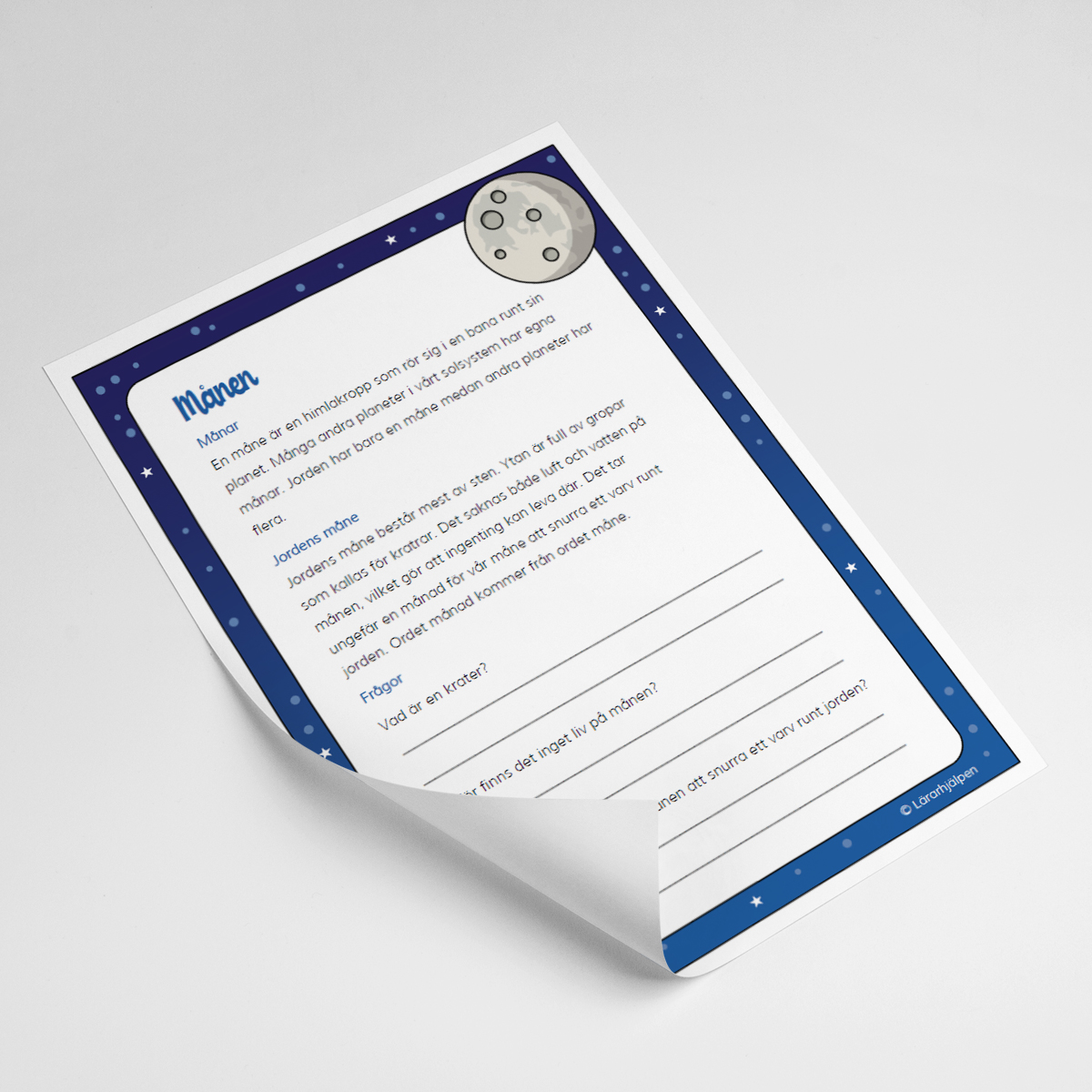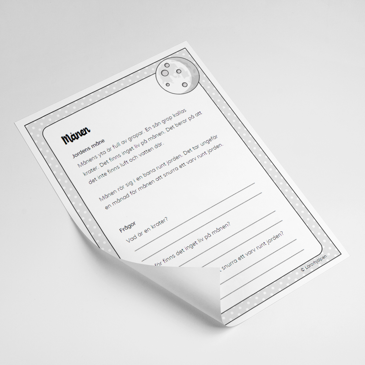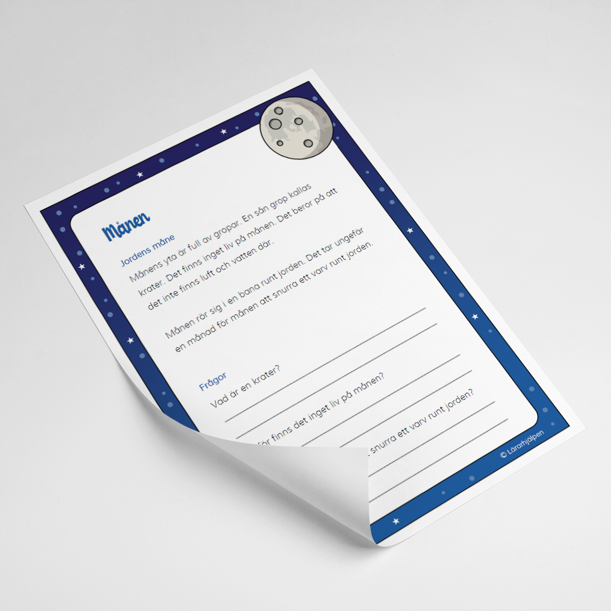 En faktatext om månen med två olika svårighetsnivåer. Det finns några läsförståelsefrågor som tillhör. Inkluderar en version i färg och en svartvit.