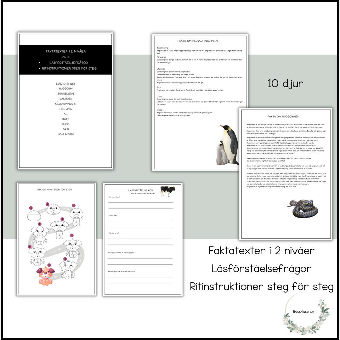 Materialet innehåller faktatexter i 2 nivåer om 10 olika djur.