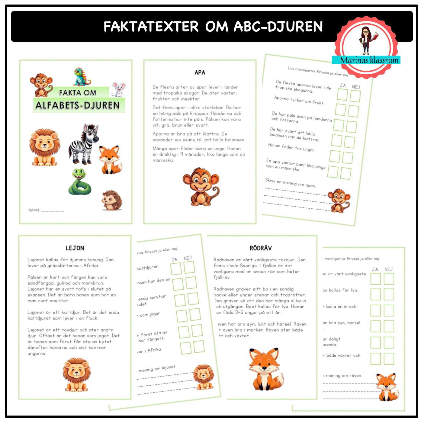 En faktatext om varje djur i alfabetet samt en sida med läsförståelse-frågor där eleverna får tänka efter vad de har läst och svara ja eller nej. De får även skriva en mening om djuret som de har lärt sig om.