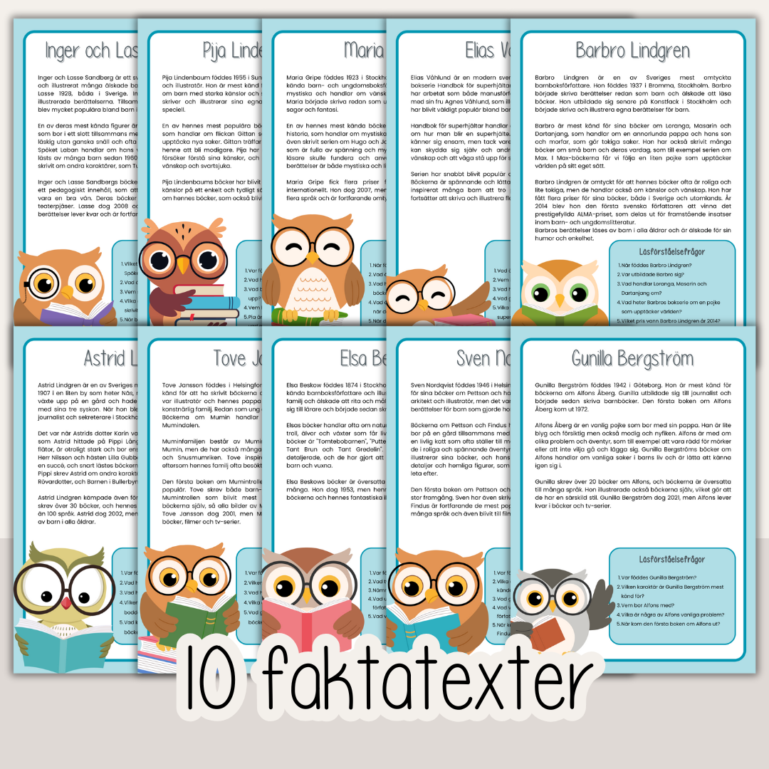 Tio olika faktatexter om barnboksförfattare med tillhörande läsförståelsefrågor.