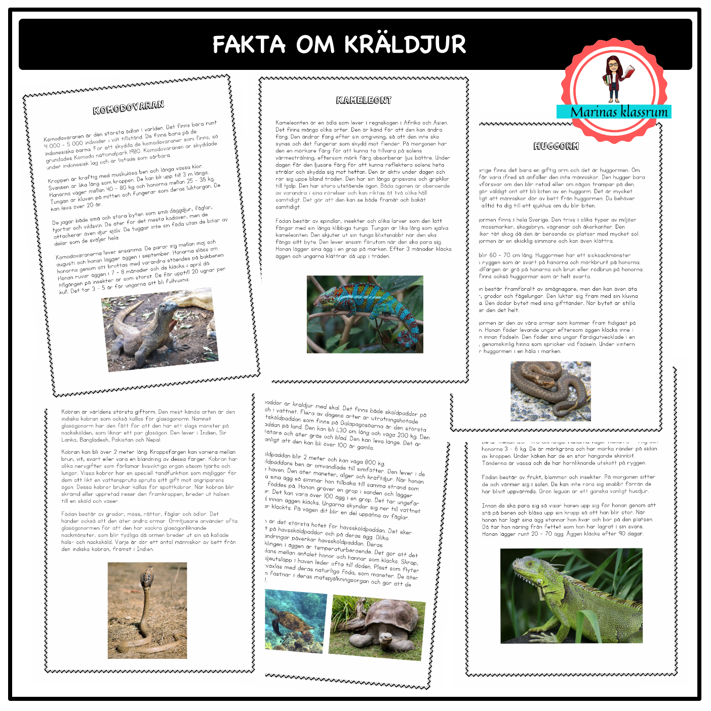 Faktatexter kring vanliga kräldjur med riktiga fotografier. Läs och fascineras av dessa spännande djur. I Sverige har vi bara 6 kräldjur och alla dem finns med samt några av de kända kräldjuren i övriga världen, totalt 20 stycken. Det finns även skrivpapper med varje kräldjur där eleverna själva kan skriva fakta.