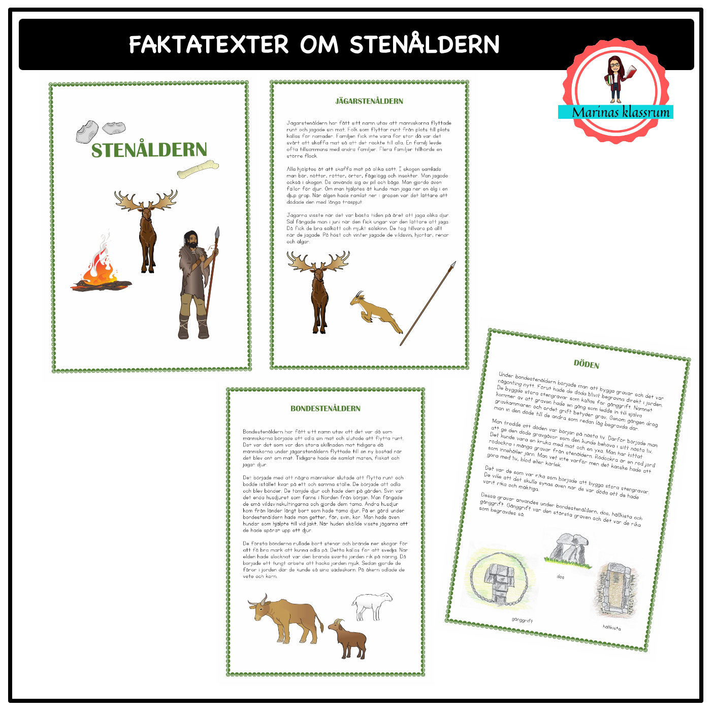 Faktatexter om stenåldern. Det finns texter kring följande områden: stenåldern allmänt, jägarstenåldern, bondestenåldern, boendet, kläder, mat, flinta, hällmålningar och döden gravsättningar.