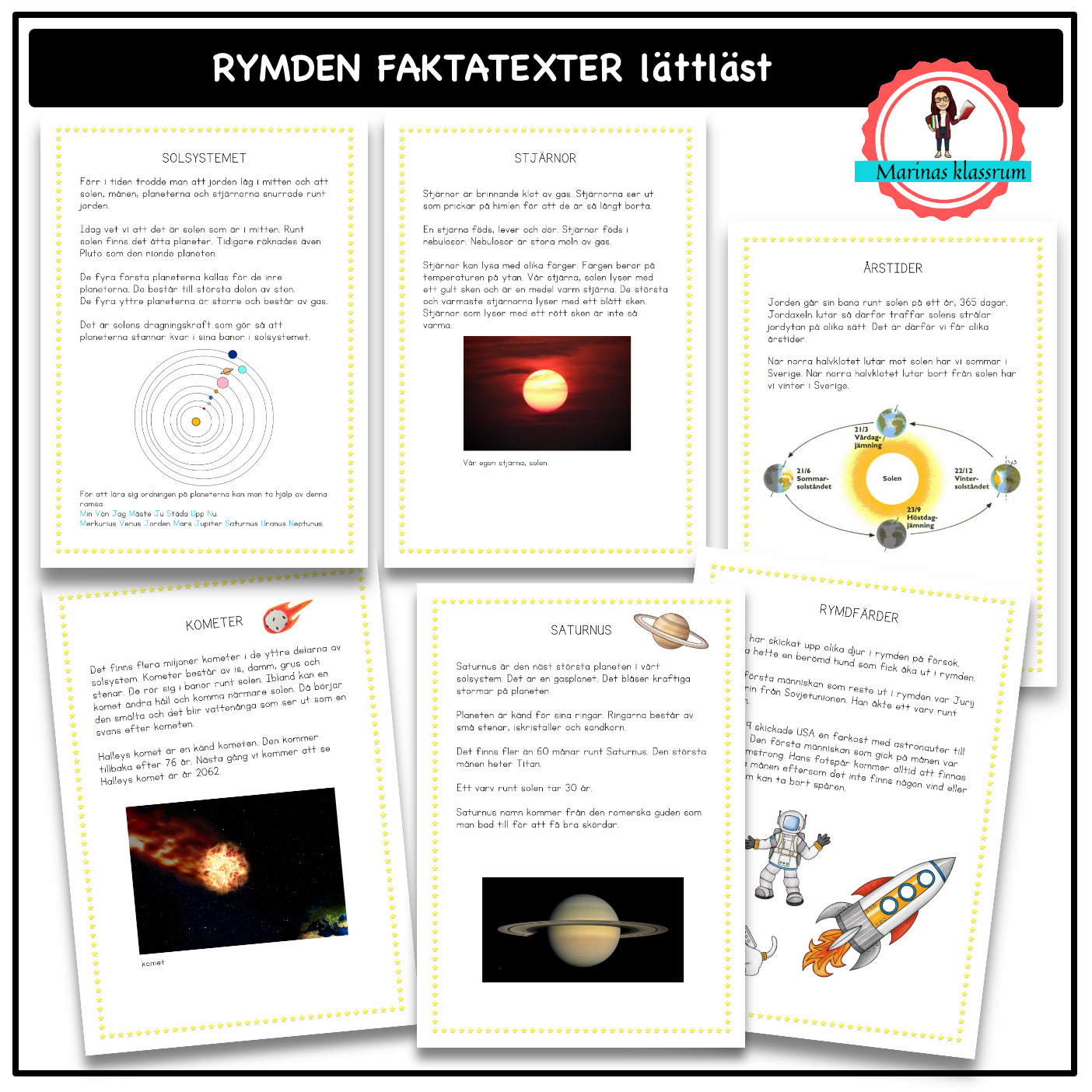 Större typsnitt, kortare texter och enklare meningar än mitt andra material med faktatexter om rymden. Rubrikerna är de samma i båda materialen, så man kan arbeta med båda i samma klass och anpassa efter elevernas behov och nivå på läsning.