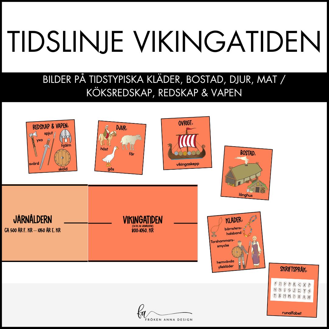 En färgkodad tidslinje med visuellt stÜd och bilder som representerar tidstypisk(a) kläder, bostad, djur, mat/kÜksredskap samt redskap och vapen till tidsepoken vikingatiden. Sätt upp pü väggen och använd en trüd / remsor och till de olika bilderna.