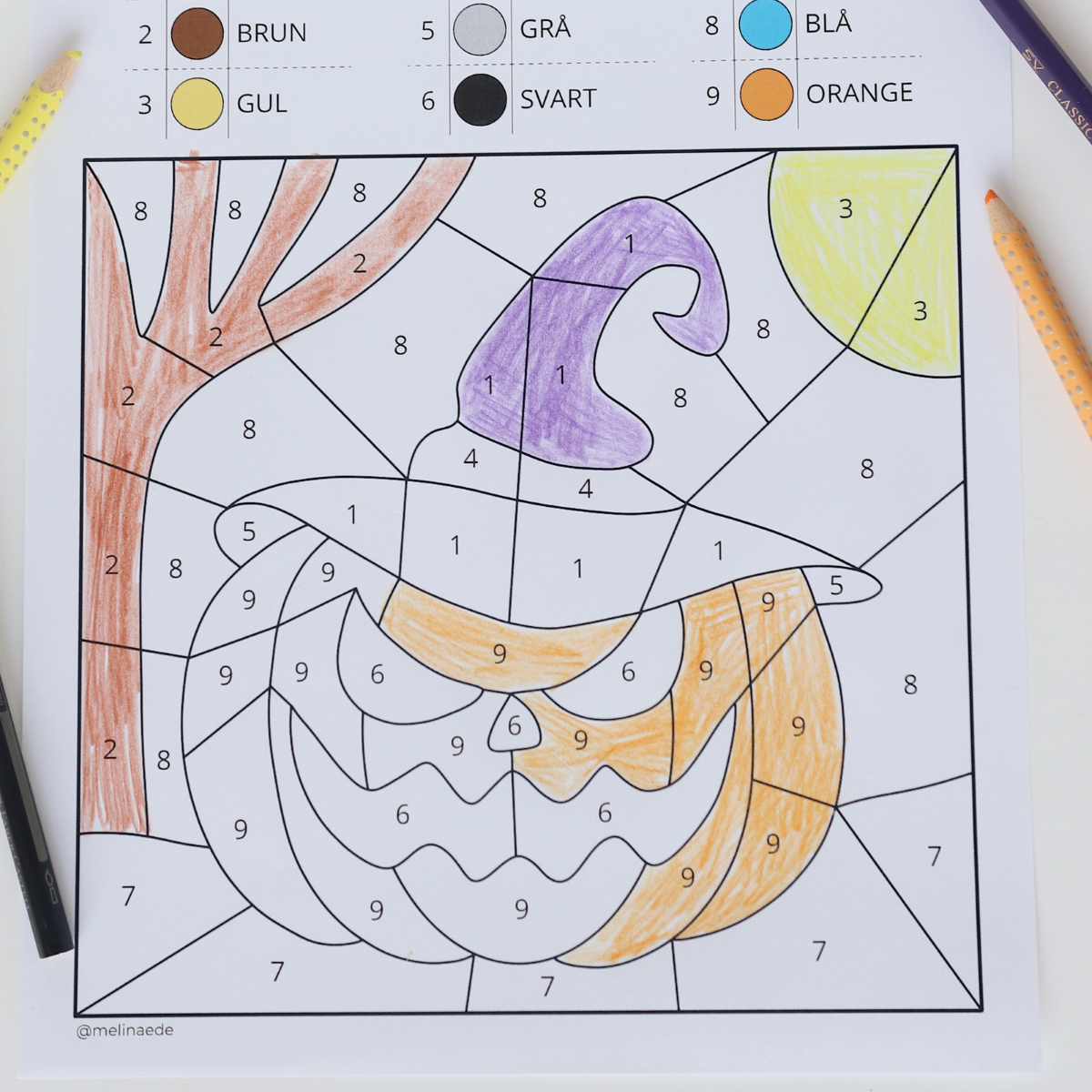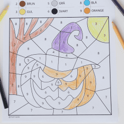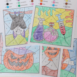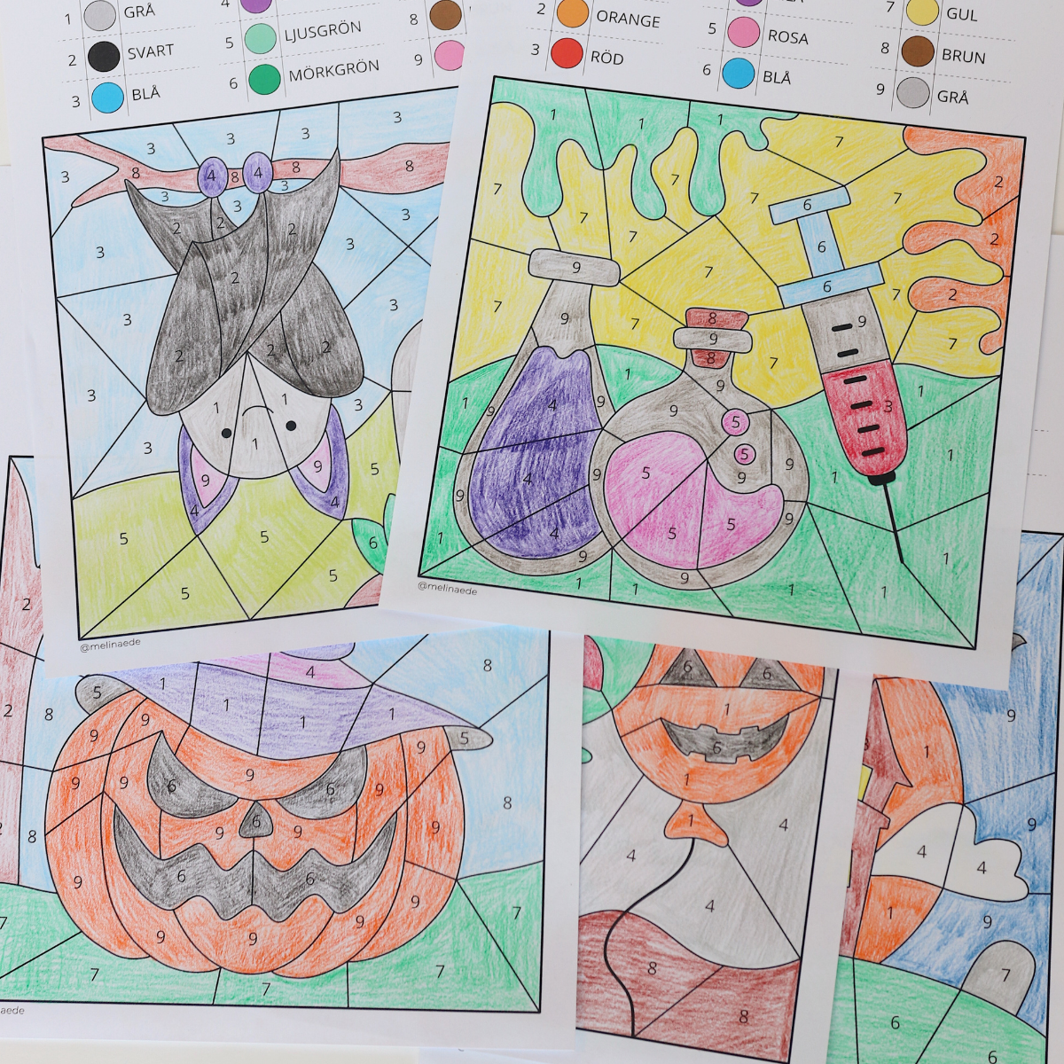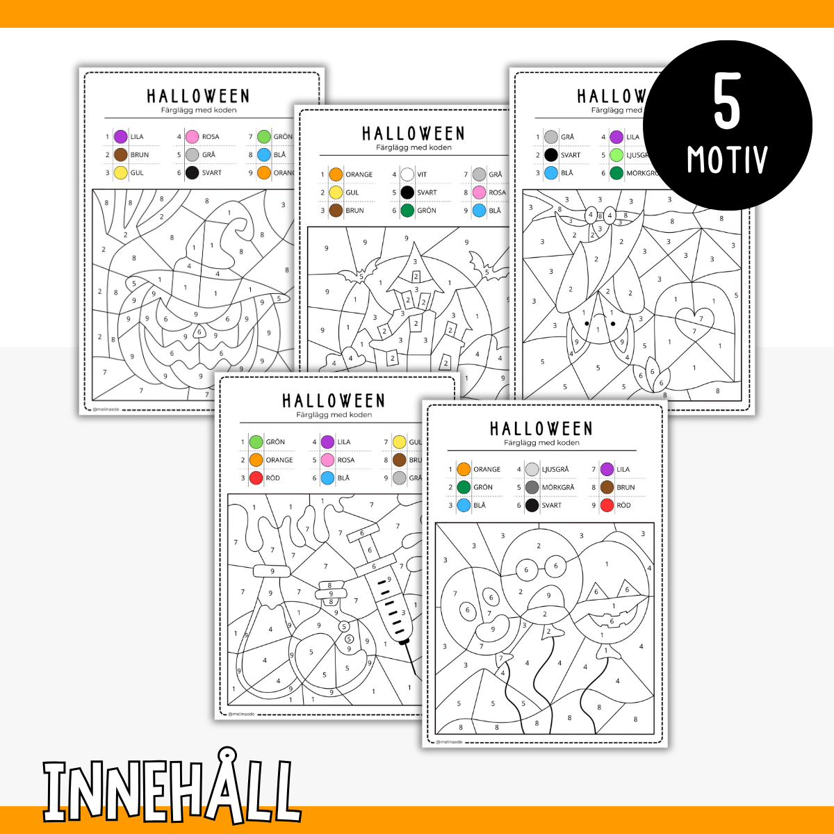 Färglägg bilder efter kod. Innehåller fem motiv att färglägga med tema halloween. Motiv: pumpa, flaskor med gift, spökhus, läskiga ballonger och fladdermus.