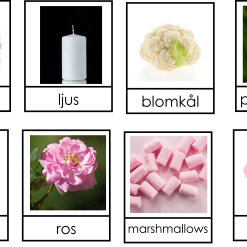 Materialet innehåller 10 färgbrickor och 40 färgbilder. Färgerna som är med är röd, orange, blå, gul, grön, lila, rosa, vit, brun och svart.