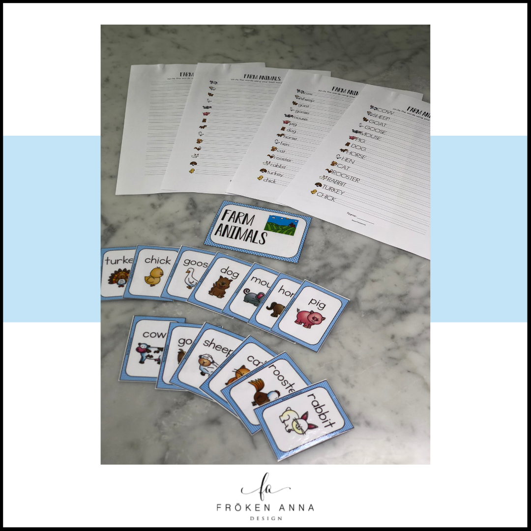 I detta set ingår 14 ordkort med bild och ord på engelska (Dessa kan även användas som memory om ni skriver ut dubbletter) samt fyra arbetsblad: i versaler, gemener samt med och utan text. och
