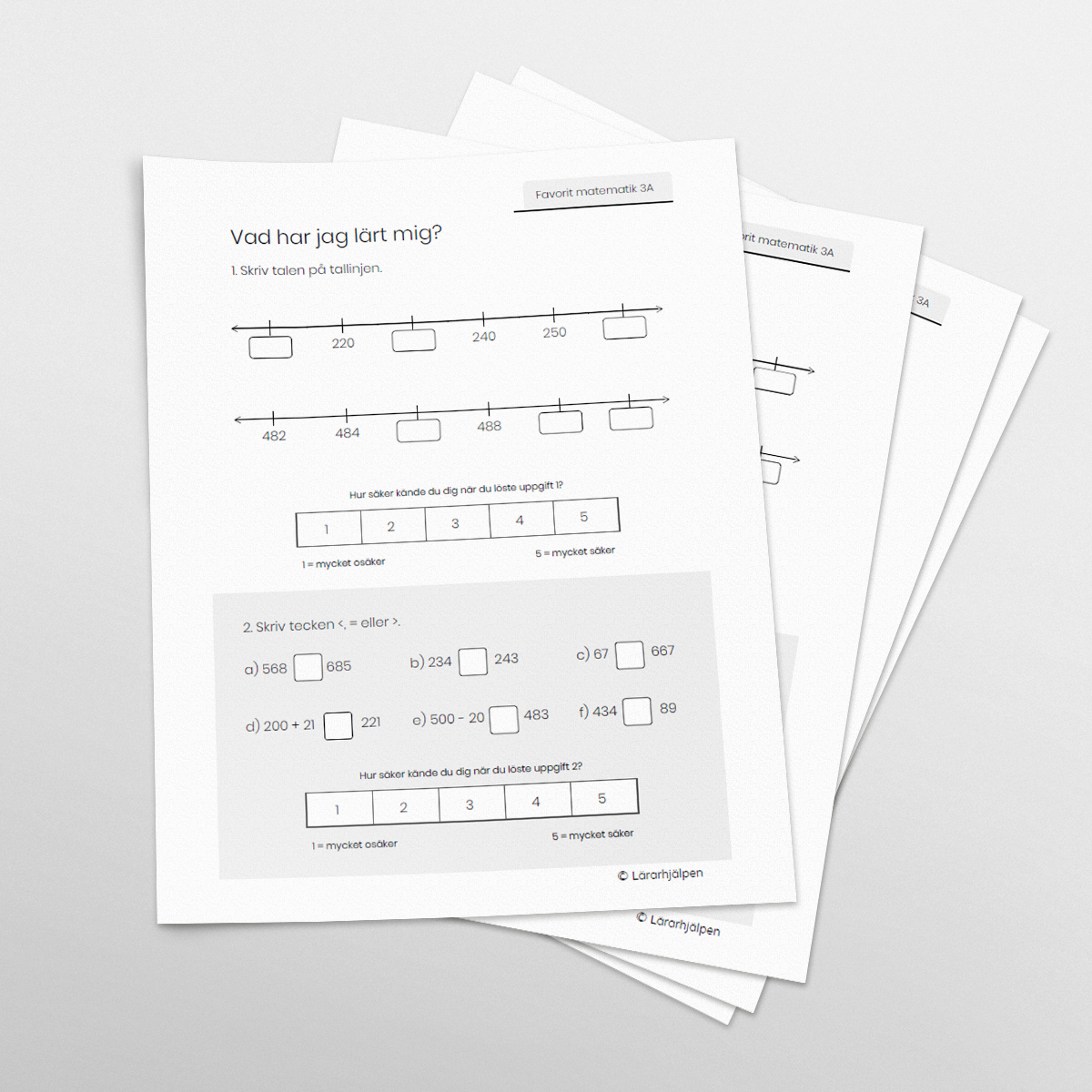 Om du vill se vad eleverna har lärt sig under terminen kan du låta dem göra detta terminstest. Du kan antingen göra testet utöver de test som finns i boken och mitt lärande eller göra testet istället för dem. Uppgifterna är baserade på innehållet i Favorit matematik 3A och har likartade uppgifter.