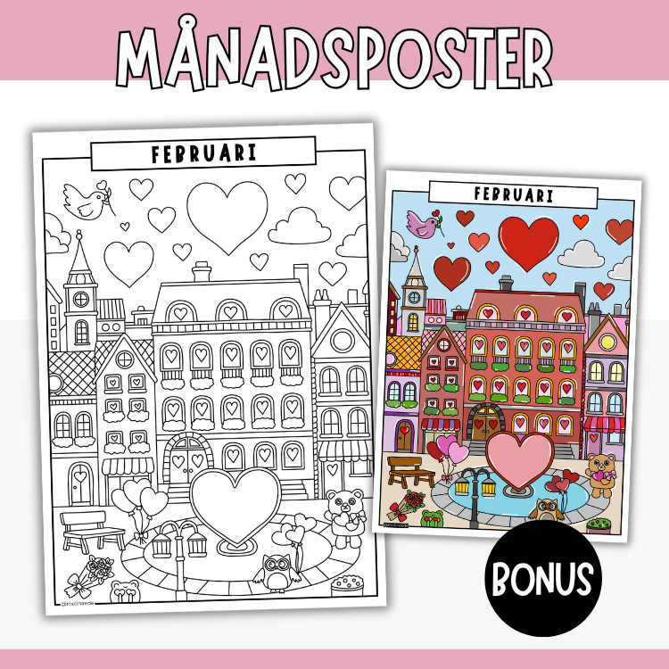 Målarbild med tema februari. Häng upp som en poster när du färglagt klart. Innehåller också en redan färglagd variant av bilden.