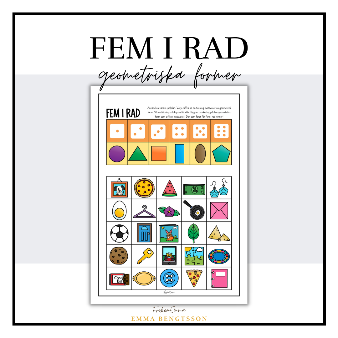 Träna på geometriska former genom att spela fem rad! Alla siffror på en tärning motsvarar en geometrisk figur. Kasta tärningen och markera den figur siffran motsvarar. Det som först får fem i rad vinner.
