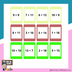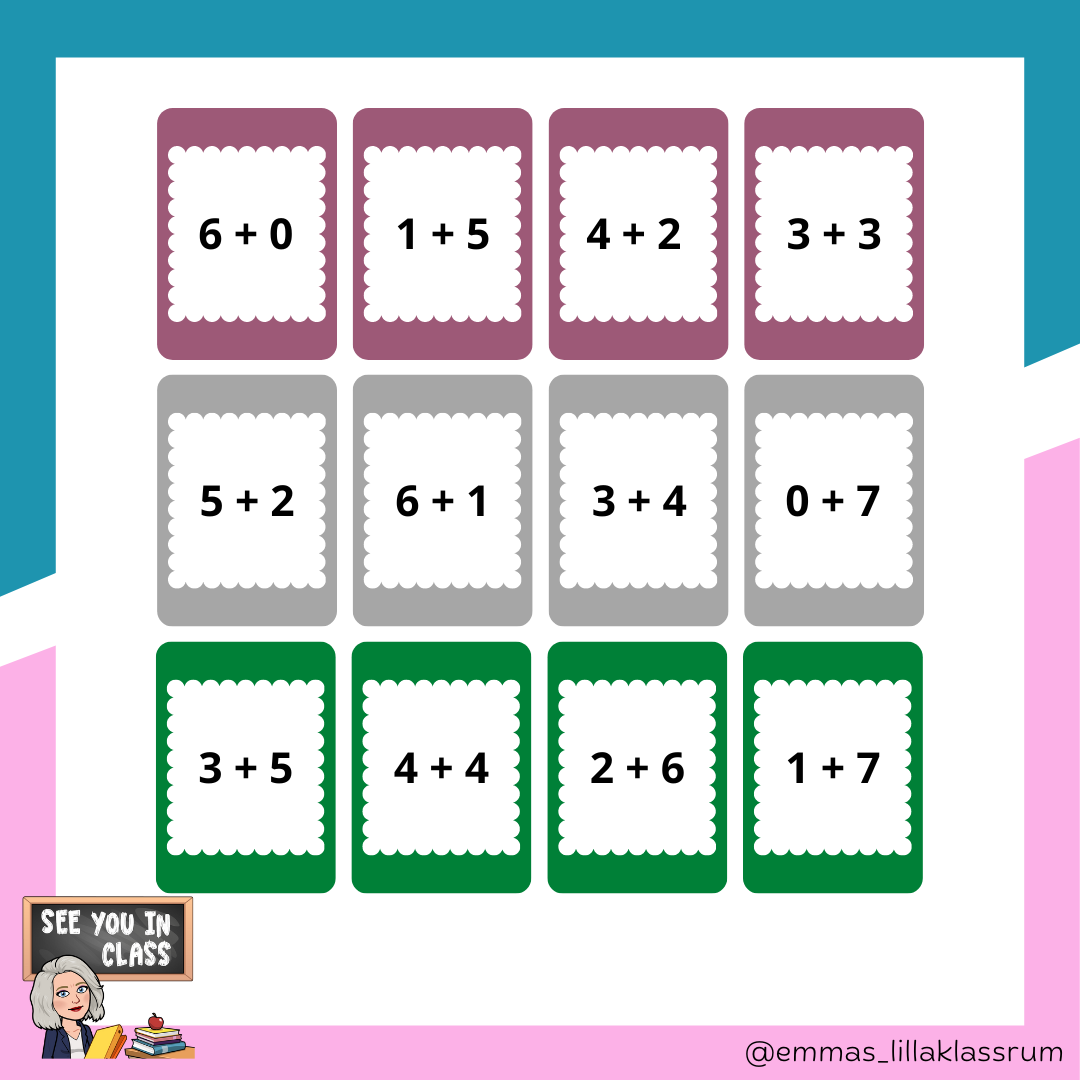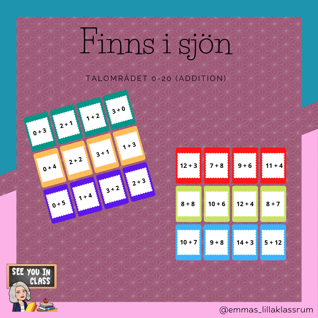 Materialet innehåller totalt 18 par (med fyra i varje), alltså totalt 72 kort. Materialet fokuserar på addition inom talområdet 0-20. Använd materialet som träningskort, para ihop dem, finns i sjön eller precis så som det passar bäst till för just din klass.