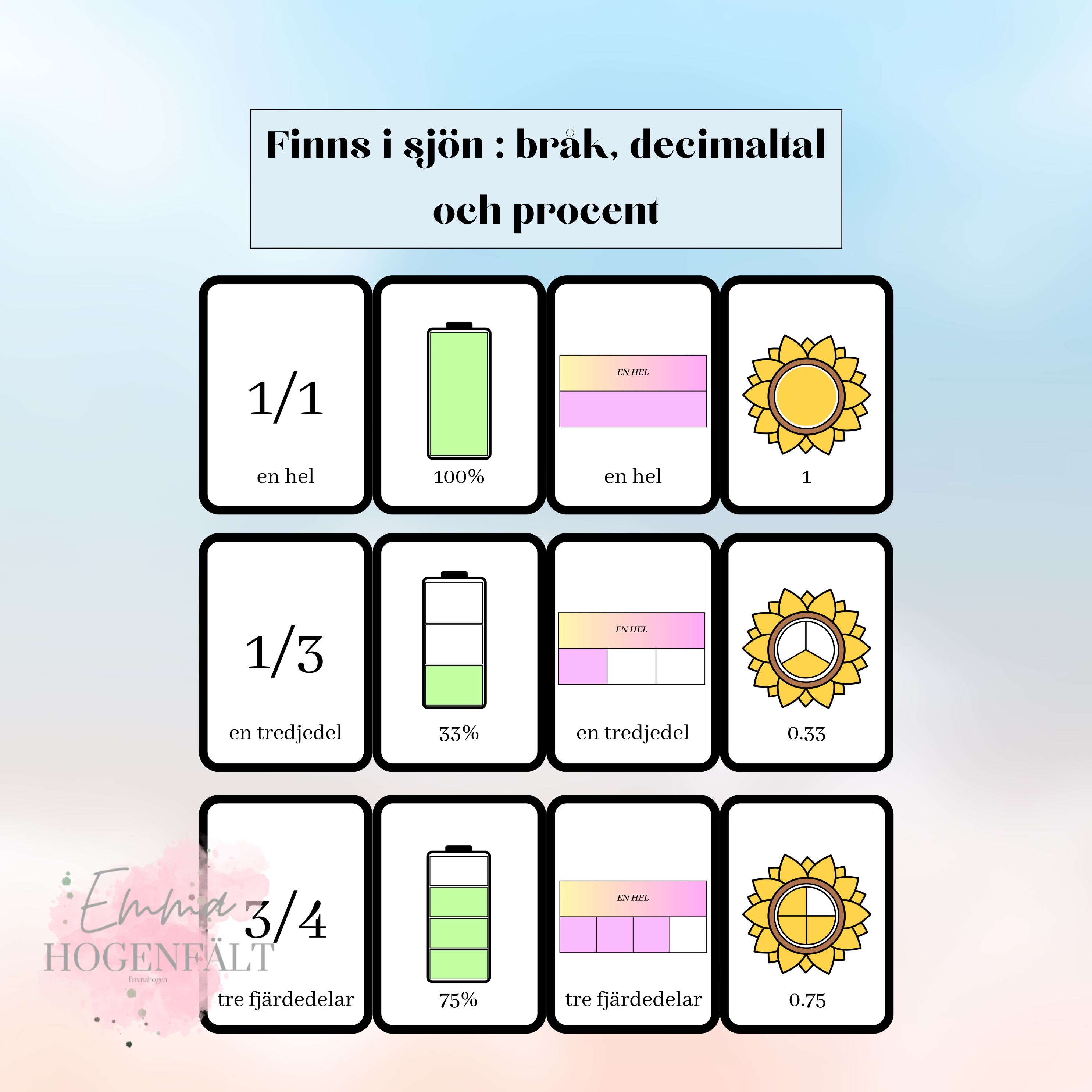 Finns i sjön med tema bråk, procent och decimaler. Ett kort i paret anger bråkformen i sifferform. Vidare visas procentsatsen av bråket genom ett mobilbatteri som baseras på bråkformen. Bråkformen representeras igen fast med bokstäver istället för siffror och genom ett bråkplank där sambandet mellan del och helhet belys. Slutligen behandlas decimaltalen som korrelerar med procentsatsen. Spelet visualiserar sambandet mellan bråk, procent och decimaltal. I materialet finns alla bråktal från 1/1-10/10 med.
