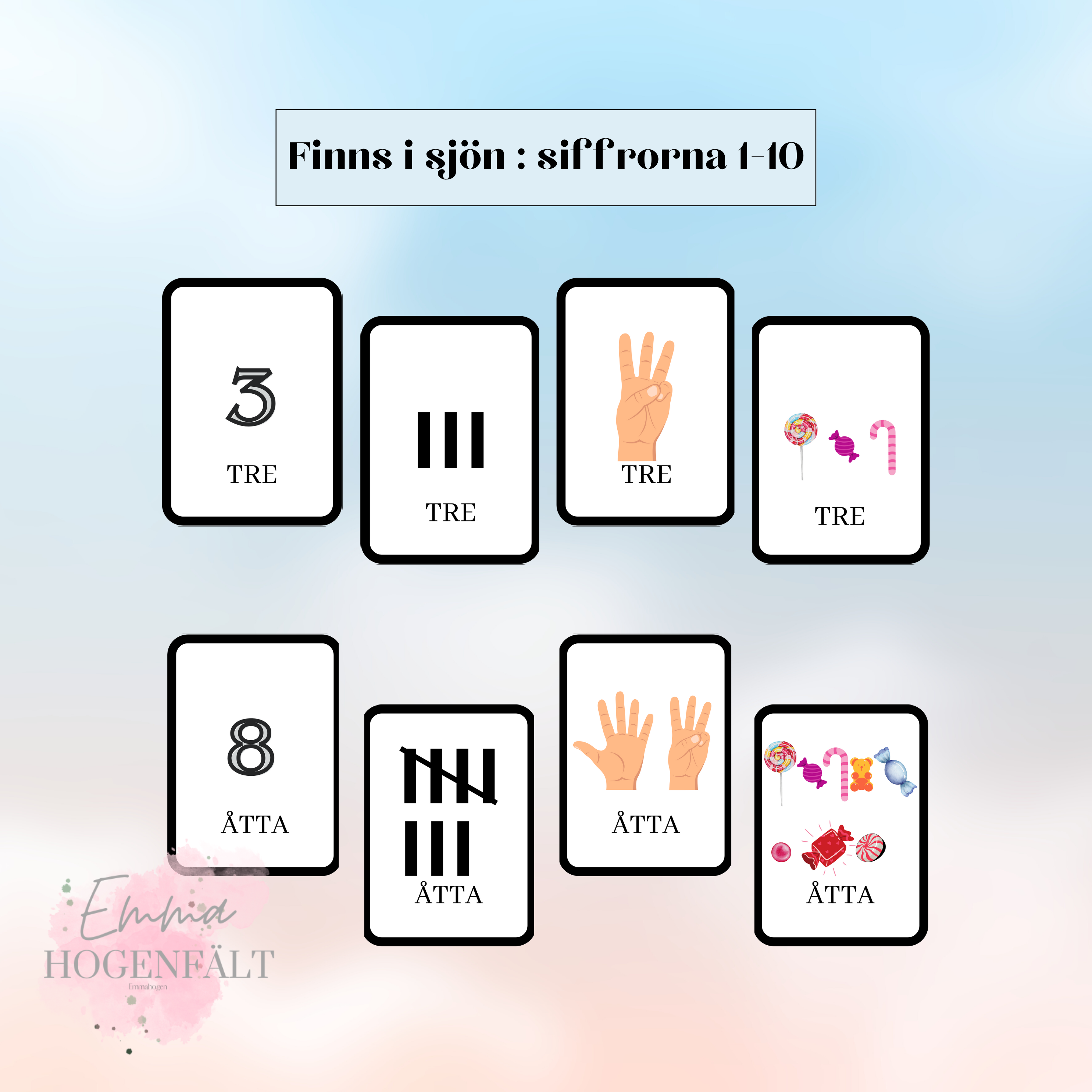 Finns i sjön – siffrorna 1-10. Spelet kombinerar olika representationsformer och antalet av siffrorna 1-10 visualiseras av fingrar, streck och godis. Godiset varierar i storlek för att uppmärksamma eleverna på att det är antalet som anger talets värde inte storleken. Siffran skrivs med bokstäver på alla kort för att eleverna ska sammanlänka ordbilden till antalet som siffran beskriver. Siffran finns också skriven på symbolspråk.