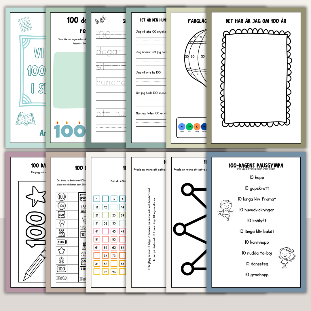 Ett arbetshäfte på nio sidor att använda för firande av 100 skoldagar!