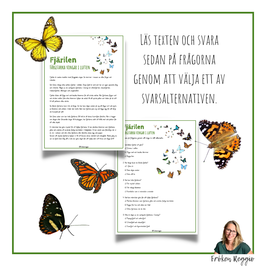 Detta är ett läsförståelsematerial där eleverna får läsa en faktatext om fjärilen och sedan svara på frågor genom att välja ett av svarsalternativen.