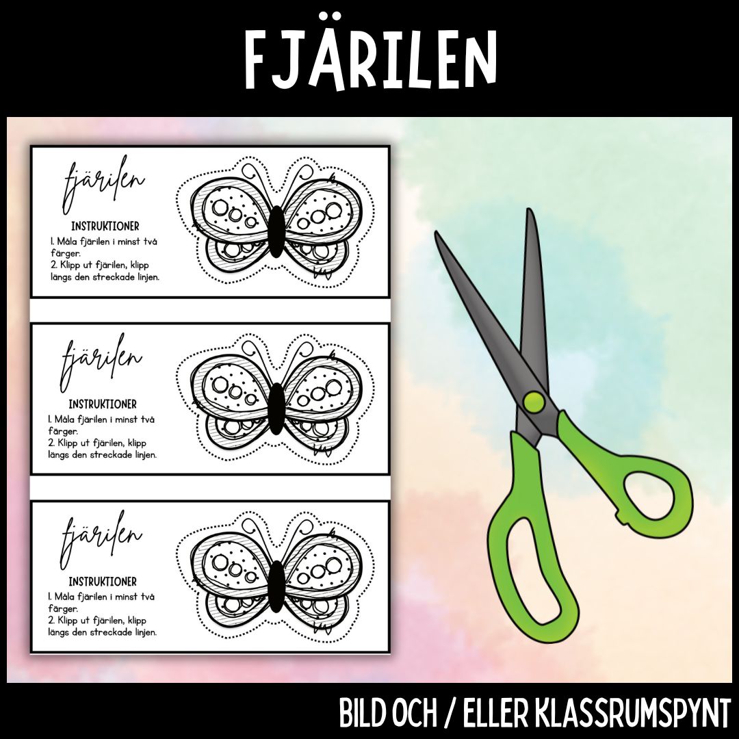 Pynta klassrummet dessa fjärilar. Använd materialet för att öva elevernas förmåga att följa instruktioner men också som en rolig aktivitet där färgläggning och dekoration av det gemensamma klassrummet står i fokus. Låt eleverna färglägga var sin fjäril innan skolavslutningen och ge som present på skolavslutningen eller använd materialet under uppstartsdagarna.